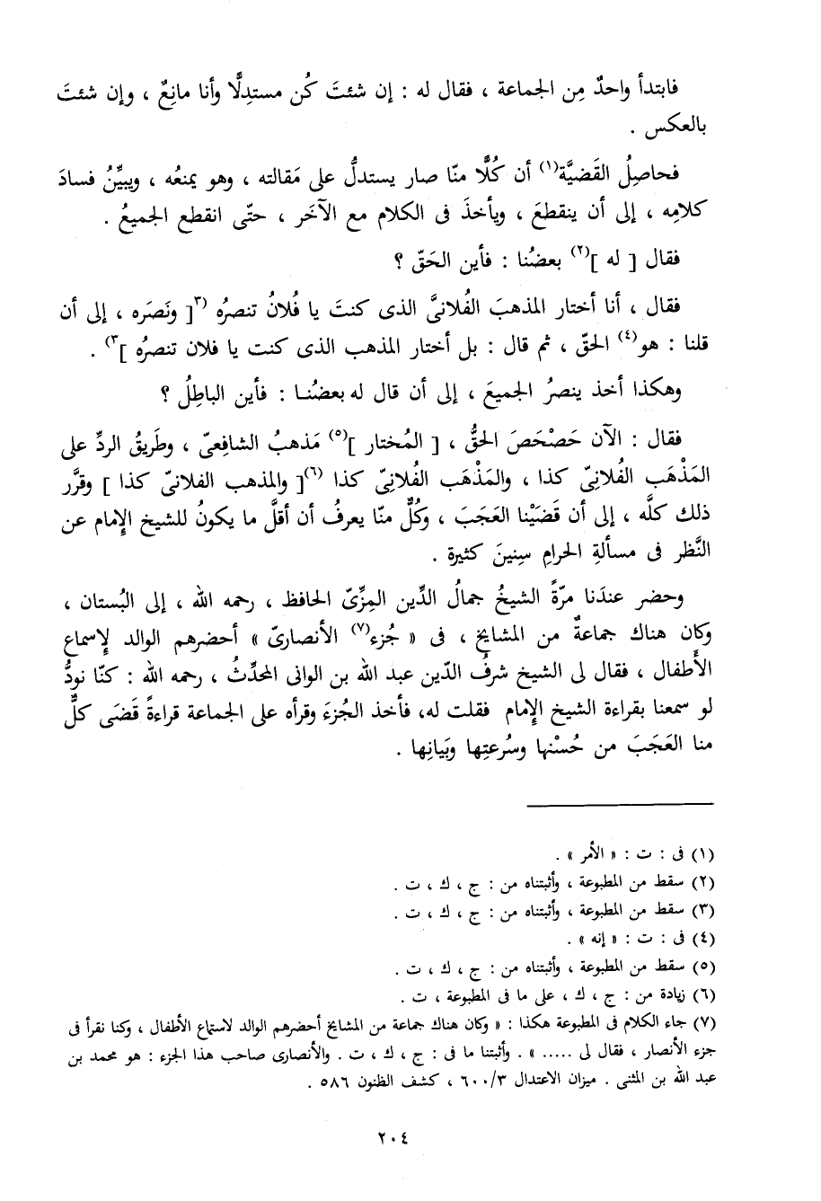 فَقَالَ أَنا أخْتَار الْمَذْهَب الْفُلَانِيّ الَّذِي كنت يَا فلَان تنصره وَنَصره إِلَى أَن قُلْنَا هُوَ الْحق ثمَّ قَالَ بل أخْتَار الْمَذْهَب الَّذِي كنت يَا فلَان تنصره
