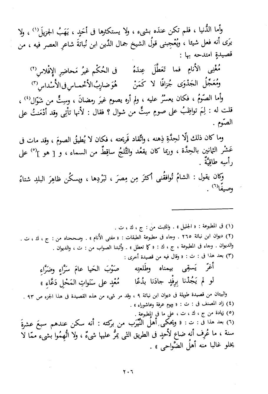 وَأما الدُّنْيَا فَلم تكن عِنْده بِشَيْء وَلَا يستكثرها فِي أحد يهب الجزيل وَلَا يرى أَنه فعل شَيْئا ويعجبني قَول الشَّيْخ جمال الدّين ابْن نباتة شَاعِر الْعَصْر فِيهِ من قصيدة امتدحه بهَا