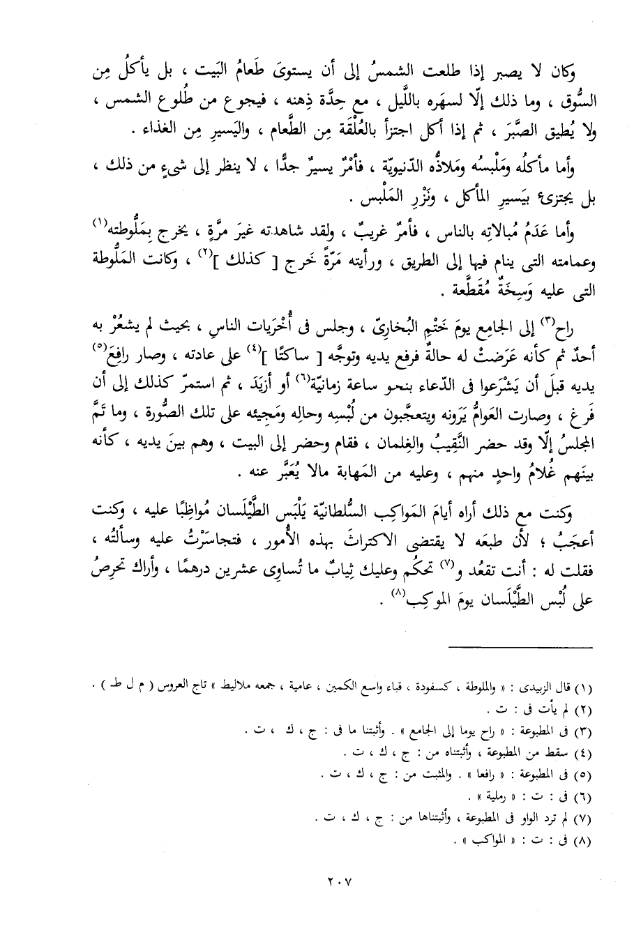 وَأما عدم مبالاته بِالنَّاسِ فَأمر غَرِيب وَلَقَد شاهدته غير مرّة يخرج بملوطته وعمامته الَّتِي ينَام فِيهَا إِلَى الطَّرِيق ورأيته مرّة خرج كَذَلِك وَكَانَت الملوطة الَّتِي عَلَيْهِ وسخة مقطعَة