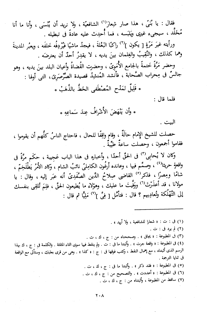 وَحضر مرّة ختمة بالجامع الْأمَوِي وَحَضَرت الْقُضَاة وأعيان الْبَلَد بَين يَدَيْهِ وَهُوَ جَالس فِي محراب الصَّحَابَة فَأَنْشد المنشد قصيدة الصرصري الَّتِي أَولهَا