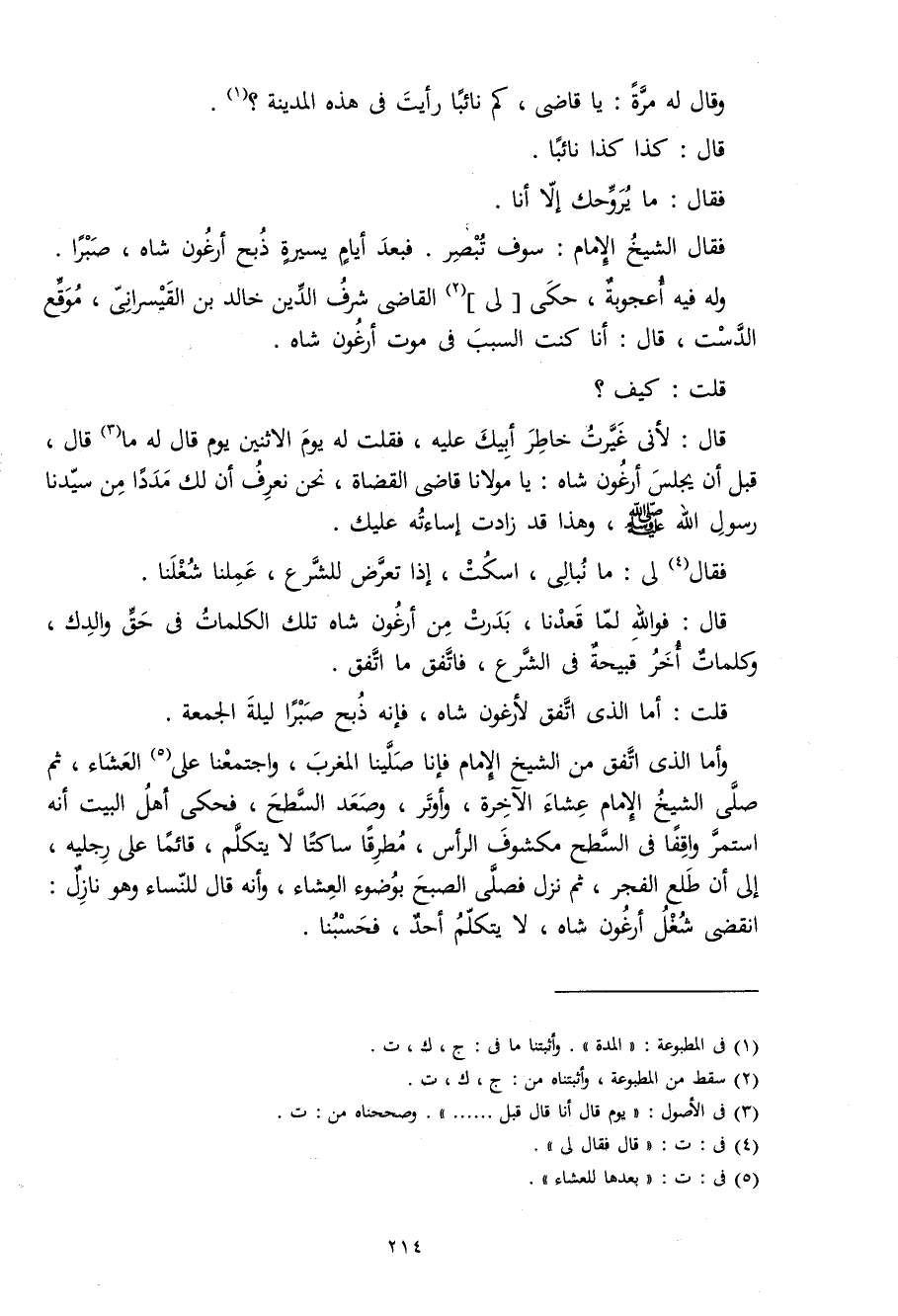 وَأما الَّذِي اتّفق من الشَّيْخ الإِمَام فَإنَّا صلينَا الْمغرب واجتمعنا على الْعشَاء ثمَّ صلى الشَّيْخ الإِمَام عشَاء الْآخِرَة وأوتر وَصعد السَّطْح فَحكى أهل الْبَيْت أَنه اسْتمرّ وَاقِفًا فِي السَّطْح مَكْشُوف الرَّأْس مطرقا ساكتا لَا يتَكَلَّم قَائِما على رجلَيْهِ إِلَى أَن طلع الْفجْر ثمَّ نزل فصلى الصُّبْح بِوضُوء الْعشَاء وَأَنه قَالَ للنِّسَاء وَهُوَ نَازل انْقَضى شغل أرغون شاه لَا يتَكَلَّم أحد فحسبنا