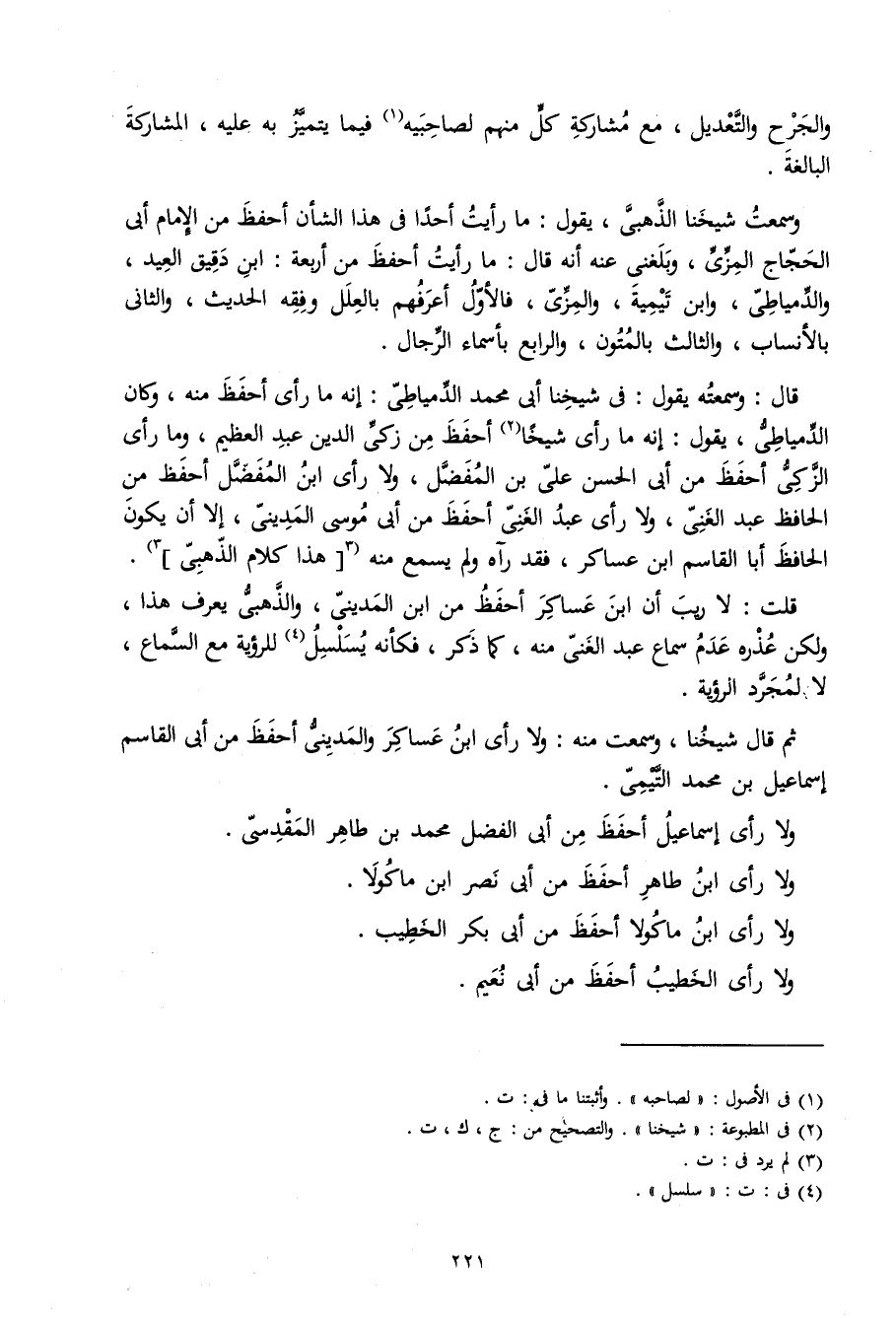 قَالَ وسمعته يَقُول فِي شَيخنَا أبي مُحَمَّد الدمياطي إِنَّه مَا رأى أحفظ مِنْهُ وَكَانَ الدمياطي يَقُول إِنَّه مَا رأى شَيخا أحفظ من زكي الدّين عبد الْعَظِيم وَمَا رأى الزكي أحفظ من أبي الْحسن عَليّ بن الْمفضل وَلَا رأى ابْن الْمفضل أحفظ من الْحَافِظ عبد الْغَنِيّ وَلَا رأى عبد الْغَنِيّ أحفظ من أبي مُوسَى الْمَدِينِيّ إِلَّا أَن يكون الْحَافِظ أَبَا الْقَاسِم ابْن عَسَاكِر فقد رَآهُ وَلم يسمع مِنْهُ هَذَا كَلَام الذَّهَبِيّ