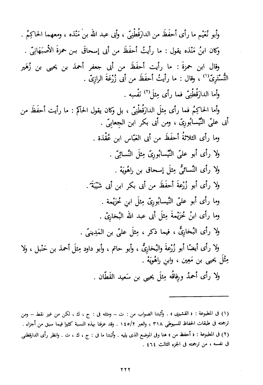 وَأما الْحَاكِم فَمَا رأى مثل الدَّارَقُطْنِيّ بل وَكَانَ يَقُول الْحَاكِم مَا رَأَيْت أحفظ من أبي عَليّ النَّيْسَابُورِي وَمن أبي بكر ابْن الجعابي