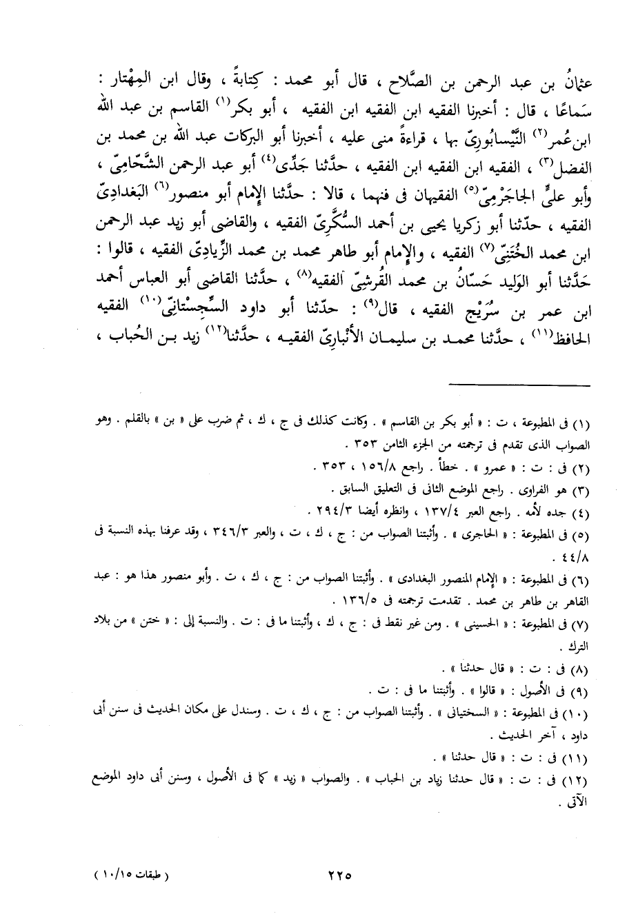 عُثْمَان بن عبد الرَّحْمَن بن الصّلاح قَالَ أَبُو مُحَمَّد كِتَابَة وَقَالَ ابْن المهتار سَمَاعا قَالَ أخبرنَا الْفَقِيه ابْن الْفَقِيه ابْن الْفَقِيه أَبُو بكر الْقَاسِم بن عبد الله ابْن عمر النَّيْسَابُورِي بهَا قِرَاءَة مني عَلَيْهِ أخبرنَا أَبُو البركات عبد الله بن مُحَمَّد بن الْفضل الْفَقِيه ابْن الْفَقِيه ابْن الْفَقِيه حَدثنَا جدي أَبُو عبد الرَّحْمَن الشحامي وَأَبُو عَليّ الجاجرمي الفقيهان فِي فنهما قَالَا حَدثنَا الإِمَام أَبُو مَنْصُور الْبَغْدَادِيّ الْفَقِيه حَدثنَا أَبُو زَكَرِيَّا يحيى بن أَحْمد السكرِي الْفَقِيه وَالْقَاضِي أَبُو زيد عبد الرَّحْمَن ابْن مُحَمَّد الختني الْفَقِيه وَالْإِمَام أَبُو طَاهِر مُحَمَّد بن مُحَمَّد الزيَادي الْفَقِيه قَالُوا حَدثنَا أَبُو الْوَلِيد حسان بن مُحَمَّد الْقرشِي الْفَقِيه حَدثنَا القَاضِي أَبُو الْعَبَّاس أَحْمد ابْن عمر بن سُرَيج الْفَقِيه قَالَ حَدثنَا أَبُو دَاوُد السجسْتانِي الْفَقِيه الْحَافِظ حَدثنَا مُحَمَّد بن سُلَيْمَان الْأَنْبَارِي الْفَقِيه حَدثنَا زيد بن الْحباب