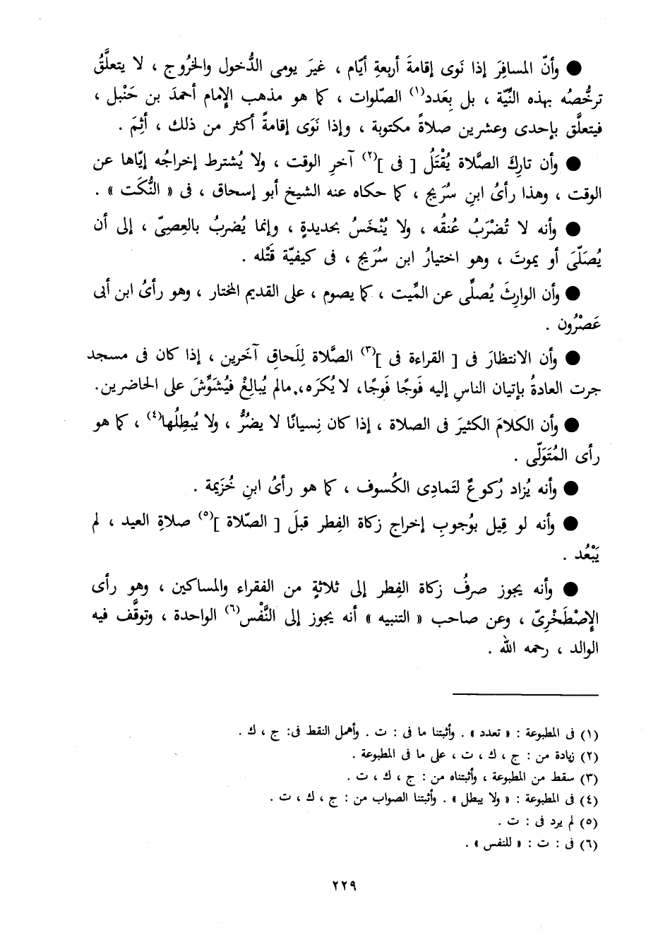 وَأَن الْمُسَافِر إِذا نوى إِقَامَة أَرْبَعَة أَيَّام غير يومي الدُّخُول وَالْخُرُوج لَا يتَعَلَّق ترخصه بِهَذِهِ النِّيَّة بل بِعَدَد الصَّلَوَات كَمَا هُوَ مَذْهَب الإِمَام أَحْمد بن حَنْبَل فَيتَعَلَّق بِإِحْدَى وَعشْرين صَلَاة مَكْتُوبَة وَإِذا نوى إِقَامَة أَكثر من ذَلِك أَثم