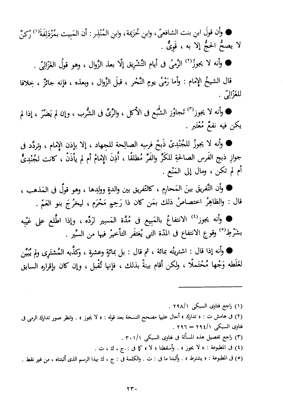 وَأَنه لَا يجوز للجندي ذبح فرسه الصَّالِحَة للْجِهَاد إِلَّا بِإِذن الإِمَام وَتردد فِي جَوَاز ذبح الْفرس الصَّالِحَة للكر والفر مُطلقًا أذن الإِمَام أم لم يَأْذَن كَانَت لجندي أم لم تكن وَمَال إِلَى الْمَنْع