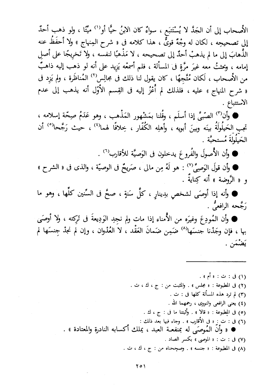 الْأَصْحَاب إِلَى أَن الْجد لَا يستتبع سَوَاء كَانَ الابْن حَيا أَو مَيتا وَلَو ذهب أحد إِلَى تَصْحِيحه لَكَانَ لَهُ وَجه قوي هَذَا كَلَامه فِي شرح الْمِنْهَاج وَلَا أحفظ عَنهُ الذّهاب إِلَى مَا لم يذهب أحد إِلَى تَصْحِيحه لَا مذهبا لنَفسِهِ وَلَا تخريجا على أصل إِمَامه وبحثت مَعَه غير مرّة فِي الْمَسْأَلَة فَلم أسمعهُ يزِيد على أَنه لَو ذهب إِلَيْهِ ذَاهِب من الْأَصْحَاب لَكَانَ متجها كَانَ يَقُول لنا ذَلِك فِي مجَالِس المناظرة وَلم يزدْ فِي شرح الْمِنْهَاج عَلَيْهِ فَلذَلِك لم أعز إِلَيْهِ فِي الْقسم الأول أَنه يذهب إِلَى عدم الاستتباع
