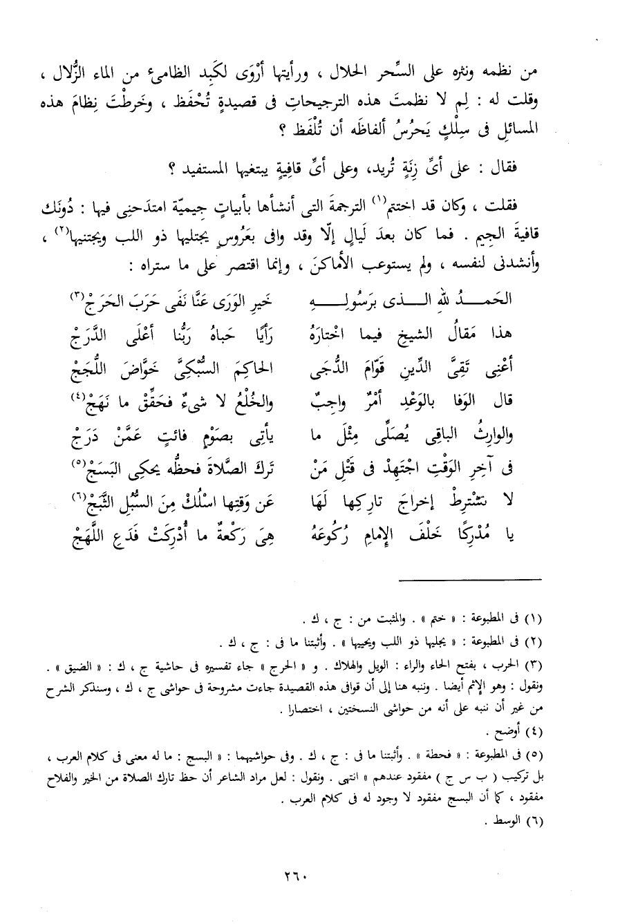 من نظمه ونثره على السحر الْحَلَال ورأيتها أروى لكبد الظامئ من المَاء الزلَال وَقلت لَهُ لم لَا نظمت هَذِه الترجيحات فِي قصيدة تحفظ وخرطت نظام هَذِه الْمسَائِل فِي سلك يحرس أَلْفَاظه أَن تلفظ