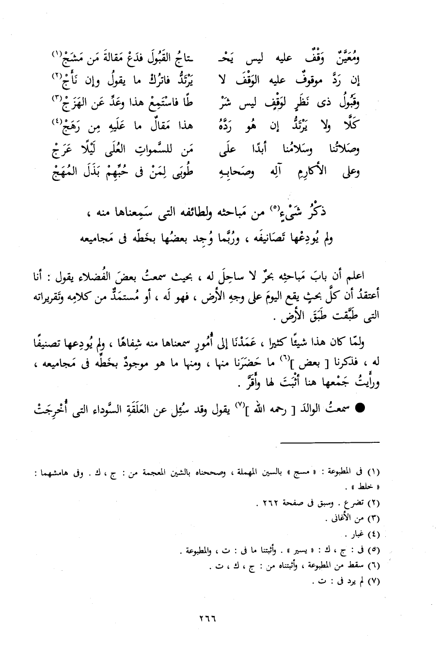 ذكر شَيْء من مباحثه ولطائفه الَّتِي سمعناها مِنْهُ وَلم يودعها تصانيفه وَرُبمَا وجد بَعْضهَا بِخَطِّهِ فِي مجاميعه