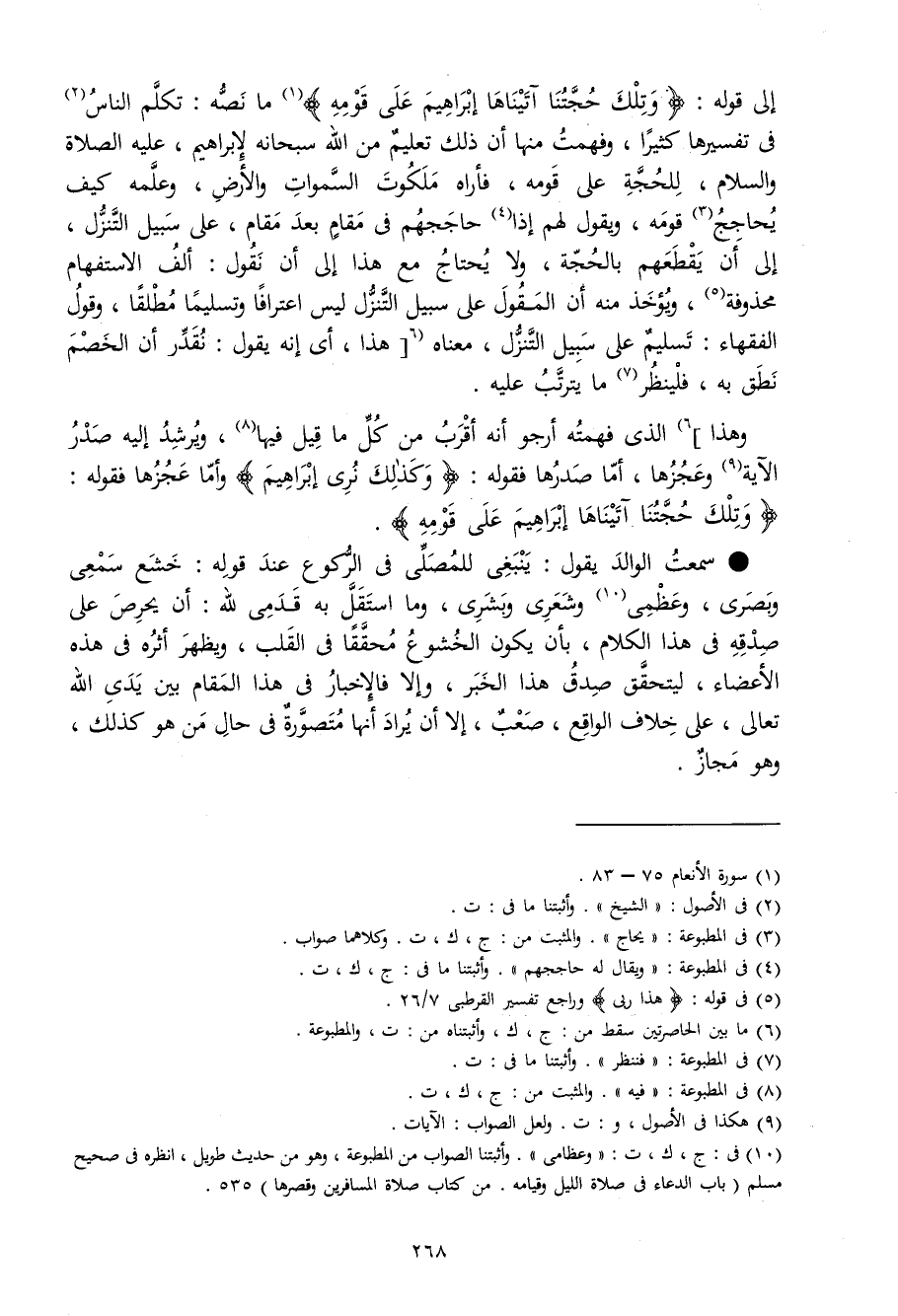 وَهَذَا الَّذِي فهمته أَرْجُو أَنه أقرب من كل مَا قيل فِيهَا ويرشد إِلَيْهِ صدر الْآيَة وعجزها أما صدرها فَقَوله {وَكَذَلِكَ نري إِبْرَاهِيم} وَأما عجزها فَقَوله {وَتلك حجتنا آتيناها إِبْرَاهِيم على قومه}
