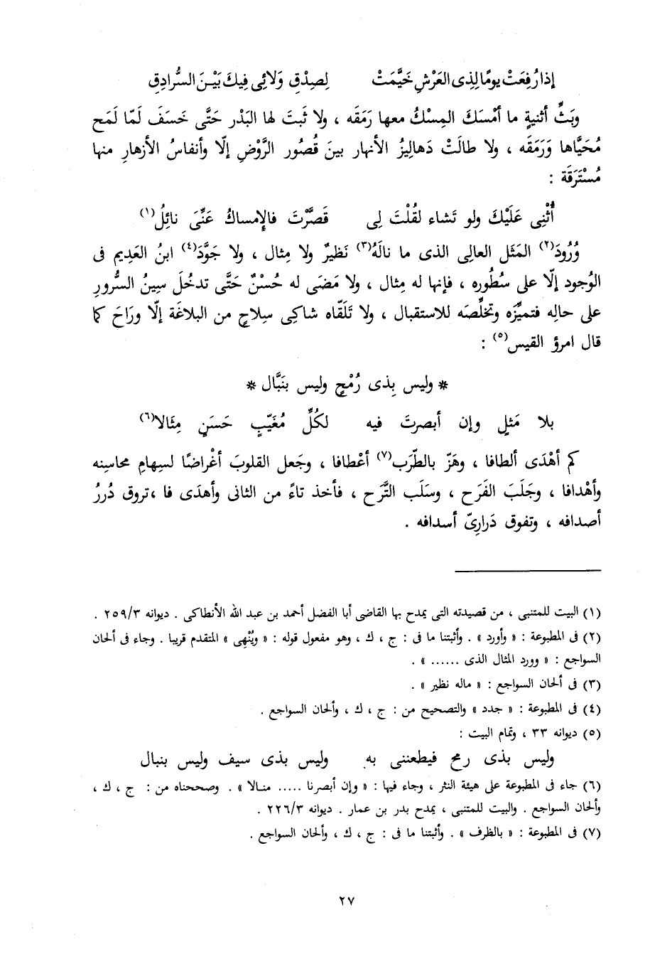 وُرُود الْمثل العالي الَّذِي مَا ناله نَظِير وَلَا مِثَال وَلَا جود ابْن العديم فِي الْوُجُود إِلَّا على سطوره فَإِنَّهَا لَهُ مِثَال وَلَا مضى لَهُ حسن حَتَّى تدخل سين السرُور على حَاله فتميزه وتخلصه للاستقبال وَلَا تَلقاهُ شاكي سلَاح من البلاغة إِلَّا وَرَاح كَمَا قَالَ امْرُؤ الْقَيْس