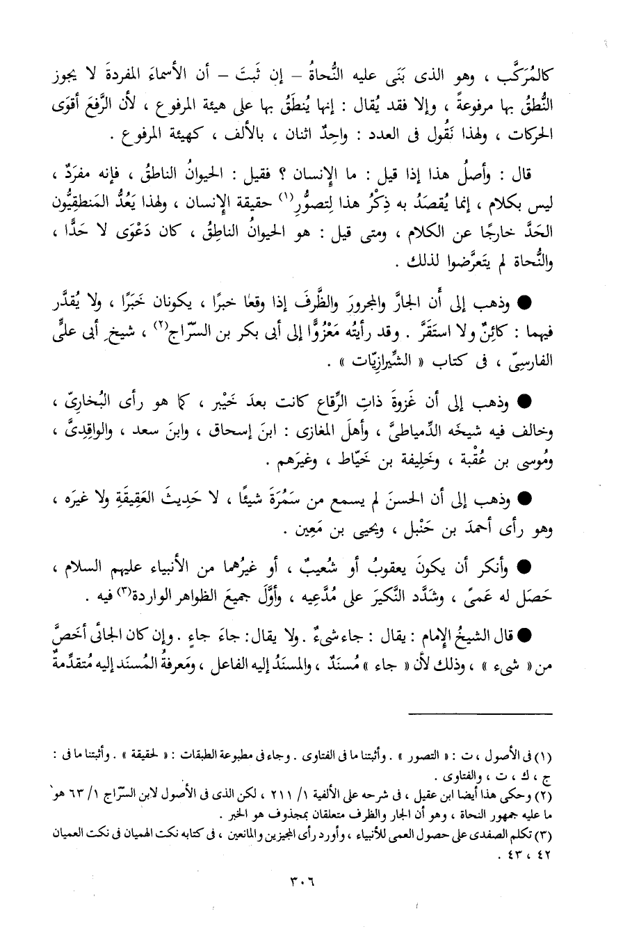 قَالَ وأصل هَذَا إِذا قيل مَا الْإِنْسَان فَقيل الْحَيَوَان النَّاطِق فَإِنَّهُ مُفْرد لَيْسَ بِكَلَام إِنَّمَا يقْصد بِهِ ذكر هَذَا لتصور حَقِيقَة الْإِنْسَان وَلِهَذَا يعد المنطقيون الْحَد خَارِجا عَن الْكَلَام وَمَتى قيل هُوَ الْحَيَوَان النَّاطِق كَانَ دَعْوَى لَا حدا والنحاة لم يتَعَرَّضُوا لذَلِك