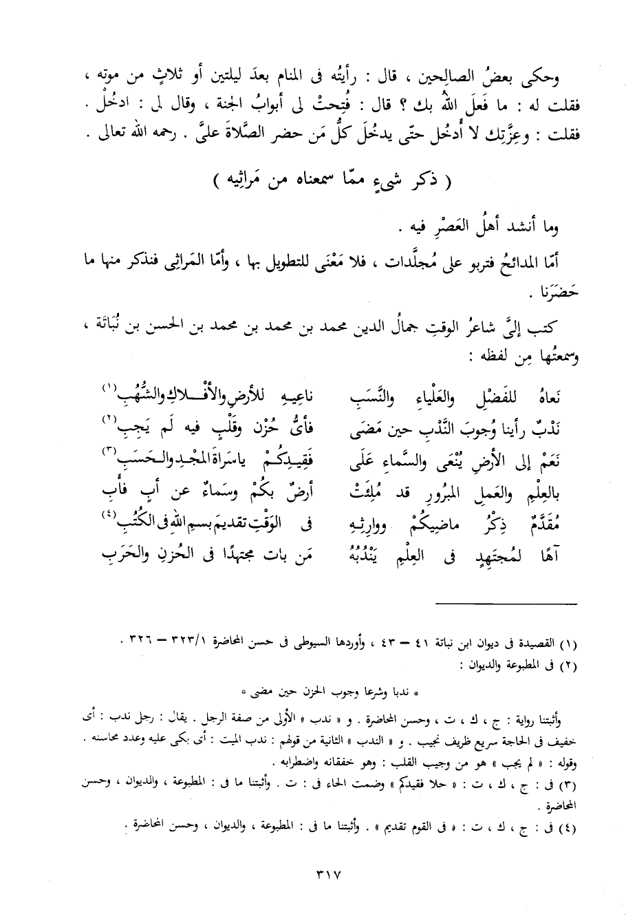 كتب إِلَيّ شَاعِر الْوَقْت جمال الدّين مُحَمَّد بن مُحَمَّد بن مُحَمَّد بن الْحسن بن نباتة وَسمعتهَا من لَفظه