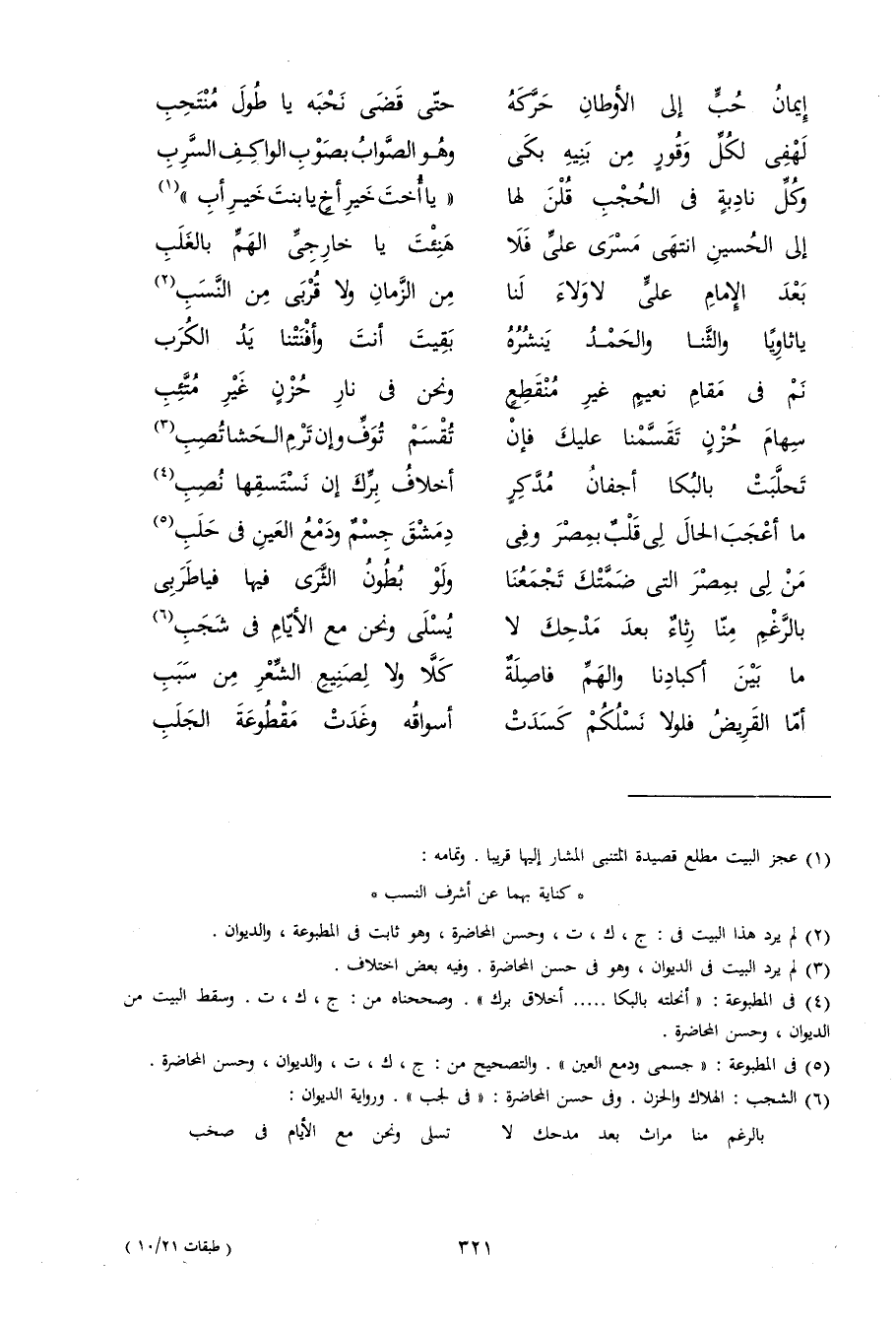 (إِيمَان حب إِلَى الأوطان حركه ... حَتَّى قضى نحبه يَا طول منتحب)