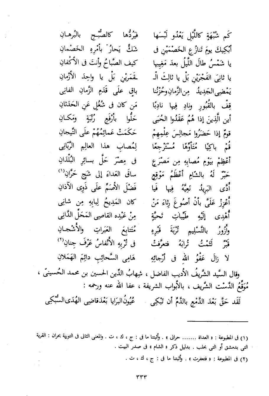 وَقَالَ السَّيِّد الشريف الأديب الْفَاضِل شهَاب الدّين الْحُسَيْن بن مُحَمَّد الْحُسَيْنِي موقع الدست الشريف بالأبواب الشَّرِيفَة عَفا الله عَنهُ ورحمه