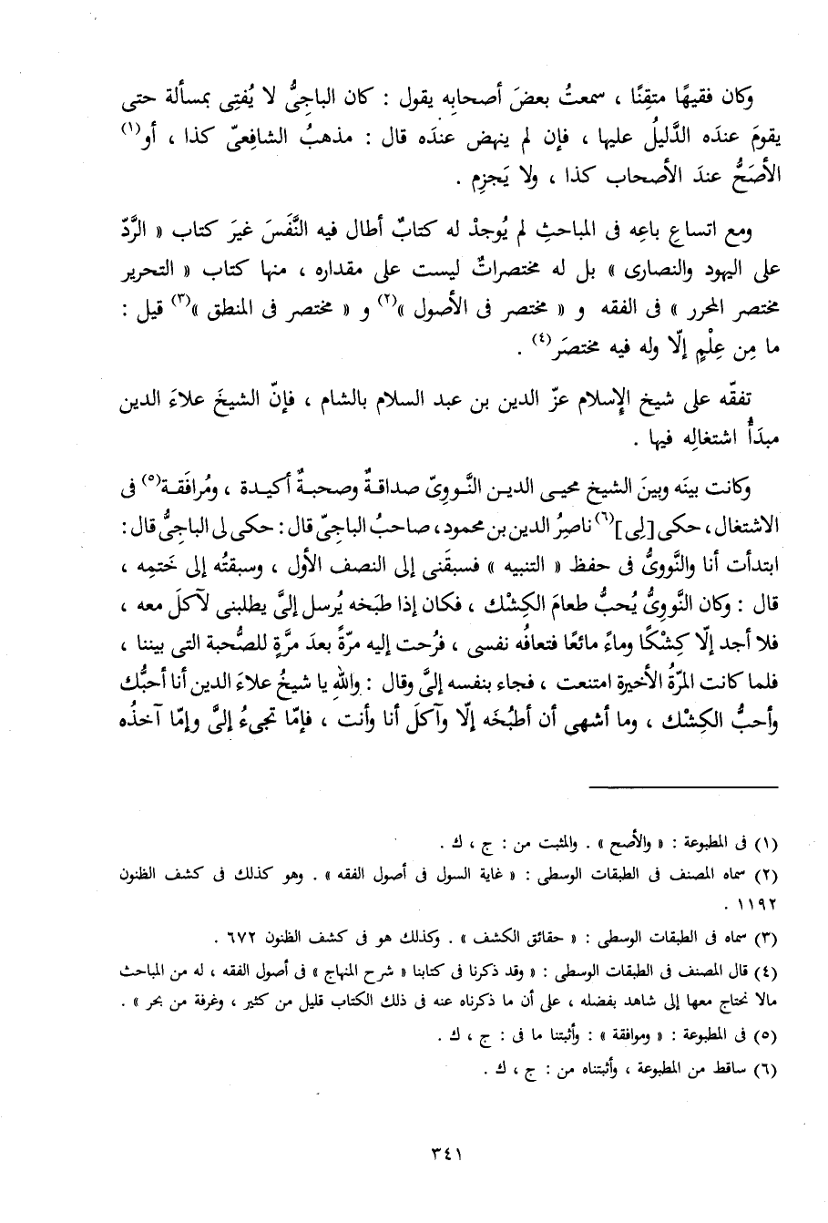 وَكَانَت بَينه وَبَين الشَّيْخ محيي الدّين النَّوَوِيّ صداقة وصحبة أكيدة ومرافقة فِي الِاشْتِغَال حكى لي نَاصِر الدّين بن مَحْمُود صَاحب الْبَاجِيّ قَالَ حكى لي الْبَاجِيّ قَالَ ابتدأت أَنا وَالنَّوَوِيّ فِي حفظ التَّنْبِيه فَسَبَقَنِي إِلَى النّصْف الأول وسبقته إِلَى خَتمه قَالَ وَكَانَ النَّوَوِيّ يحب طَعَام الكشك فَكَانَ إِذا طبخه يُرْسل إِلَيّ يطلبني لآكل مَعَه فَلَا أجد إِلَّا كشكا وَمَاء مَائِعا فتعافه نَفسِي فرحت إِلَيْهِ مرّة بعد مرّة للصحبة الَّتِي بَيْننَا فَلَمَّا كَانَت الْمرة الْأَخِيرَة امْتنعت فجَاء بِنَفسِهِ إِلَيّ وَقَالَ وَالله يَا شيخ عَلَاء الدّين أَنا أحبك وَأحب الكشك وَمَا أشهى أَن أطبخه إِلَّا وآكل أَنا وَأَنت فإمَّا تَجِيء إِلَيّ وَإِمَّا آخذه