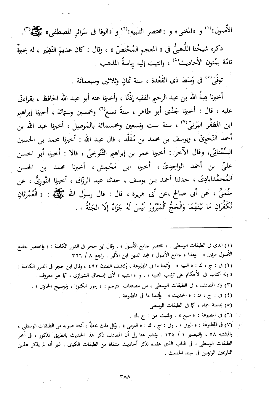 أخبرنَا هبة الله بن عبد الرَّحِيم الْفَقِيه إِذْنا وَأخْبرنَا عَنهُ أَبُو عبد الله الْحَافِظ بِقِرَاءَتِي عَلَيْهِ قَالَ أخبرنَا جدي أَبُو طَاهِر سنة تسع وَخمسين وسِتمِائَة أخبرنَا إِبْرَاهِيم ابْن المظفر البرني سنة سِتّ وَتِسْعين وَخَمْسمِائة بالموصل أخبرنَا عبد الله بن أَحْمد النَّحْوِيّ ويوسف بن مُحَمَّد بن مقلد قَالَ عبد الله أخبرنَا مُحَمَّد بن الْحُسَيْن السمناني وَقَالَ الآخر أخبرنَا عمر بن إِبْرَاهِيم التنوخي قَالَا أخبرنَا أَبُو الْحسن عَليّ بن أَحْمد الواحدي أخبرنَا ابْن محمش أخبرنَا مُحَمَّد بن الْحسن المحمدابادي حَدثنَا أَحْمد بن يُوسُف حَدثنَا عبد الرَّزَّاق أخبرنَا الثَّوْريّ عَن سمي عَن أبي صَالح عَن أبي هُرَيْرَة قَالَ قَالَ رَسُول الله صلى الله عَلَيْهِ وَسلم (العمرتان تكفران مَا بَينهمَا وَالْحج المبرور لَيْسَ لَهُ جَزَاء إِلَّا الْجنَّة)