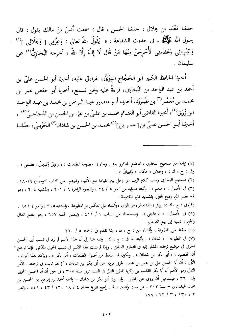حَدثنَا معبد بن هِلَال حَدثنَا الْحسن قَالَ سَمِعت أنس بن مَالك يَقُول قَالَ رَسُول الله صلى الله عَلَيْهِ وَسلم فِي حَدِيث الشَّفَاعَة (يَقُول الله تَعَالَى وَعِزَّتِي وَجَلَالِي وكبريائي وعظمتي لأخْرجَن مِنْهَا من قَالَ لَا إِلَه إِلَّا الله) // أخرجه البُخَارِيّ // عَن سُلَيْمَان