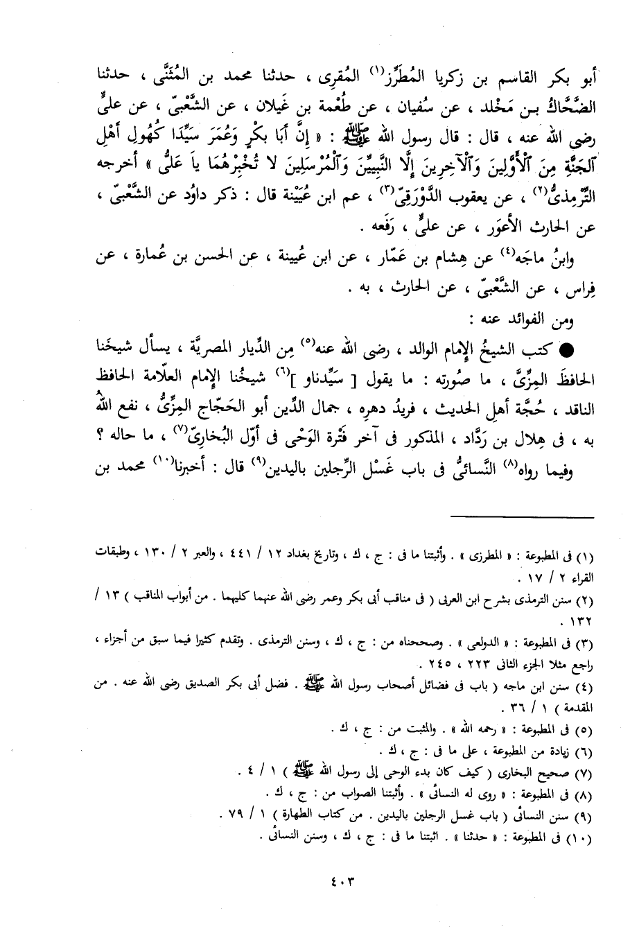 أَبُو بكر الْقَاسِم بن زَكَرِيَّا الْمُطَرز الْمقري حَدثنَا مُحَمَّد بن الْمثنى حَدثنَا الضَّحَّاك بن مخلد عَن سُفْيَان عَن طعمة بن غيلَان عَن الشّعبِيّ عَن عَليّ رَضِي الله عَنهُ قَالَ قَالَ رَسُول الله صلى الله عَلَيْهِ وَسلم (إِن أَبَا بكر وَعمر سيدا كهول أهل الْجنَّة من الْأَوَّلين والآخرين إِلَّا النَّبِيين وَالْمُرْسلِينَ لَا تخبرهما يَا عَليّ) // أخرجه التِّرْمِذِيّ // عَن يَعْقُوب الدَّوْرَقِي عَم ابْن عُيَيْنَة قَالَ ذكر دَاوُد عَن الشّعبِيّ عَن الْحَارِث الْأَعْوَر عَن عَليّ رَفعه