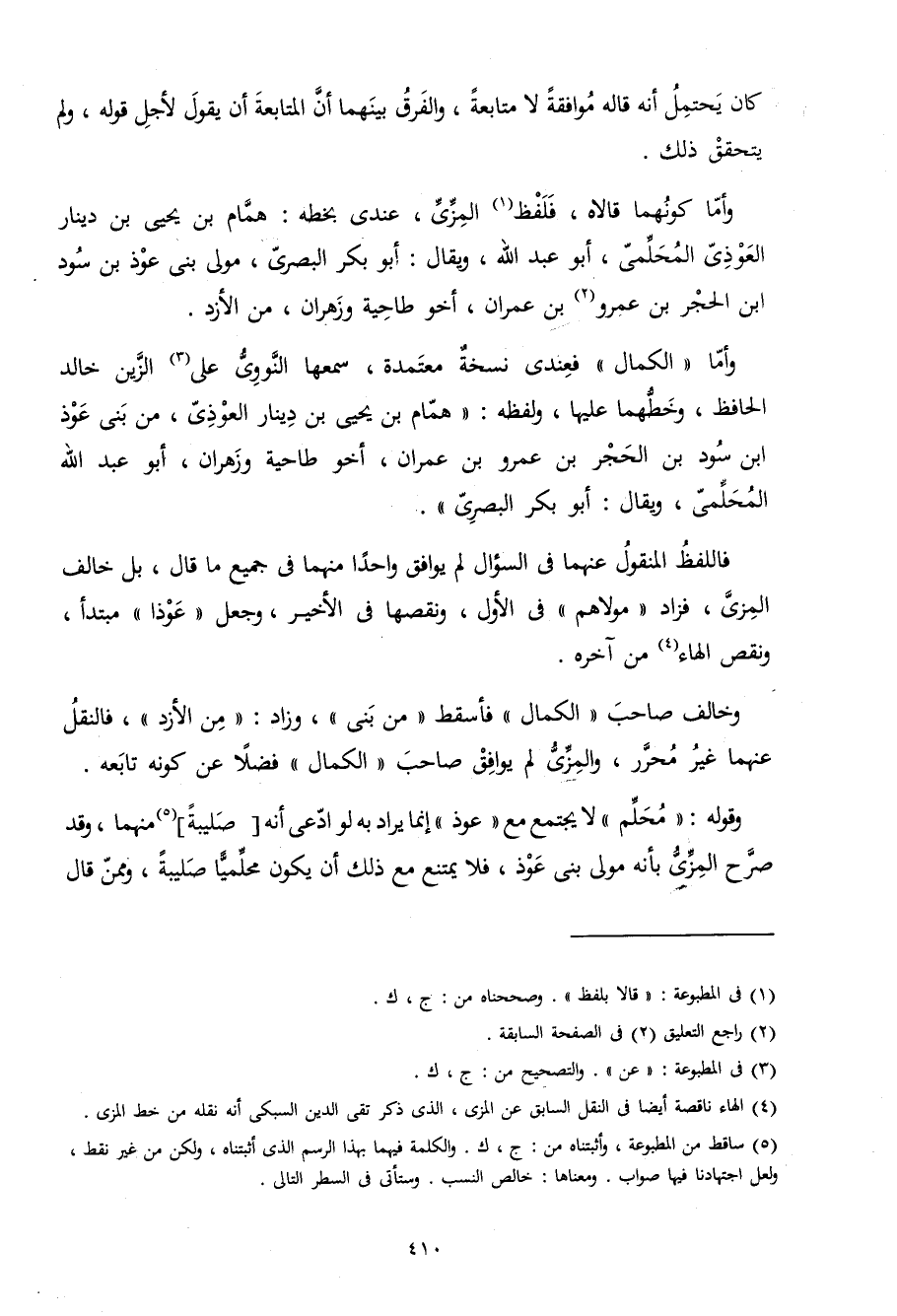 وَأما الْكَمَال فعندي نُسْخَة مُعْتَمدَة سَمعهَا النَّوَوِيّ عَليّ الزين خَالِد الْحَافِظ وخطهما عَلَيْهَا وَلَفظه همام بن يحيى بن دِينَار العوذي من بني عوذ ابْن سود بن الْحجر بن عَمْرو بن عمرَان أَخُو طاحية وزهران أَبُو عبد الله المحلمي وَيُقَال أَبُو بكر الْبَصْرِيّ
