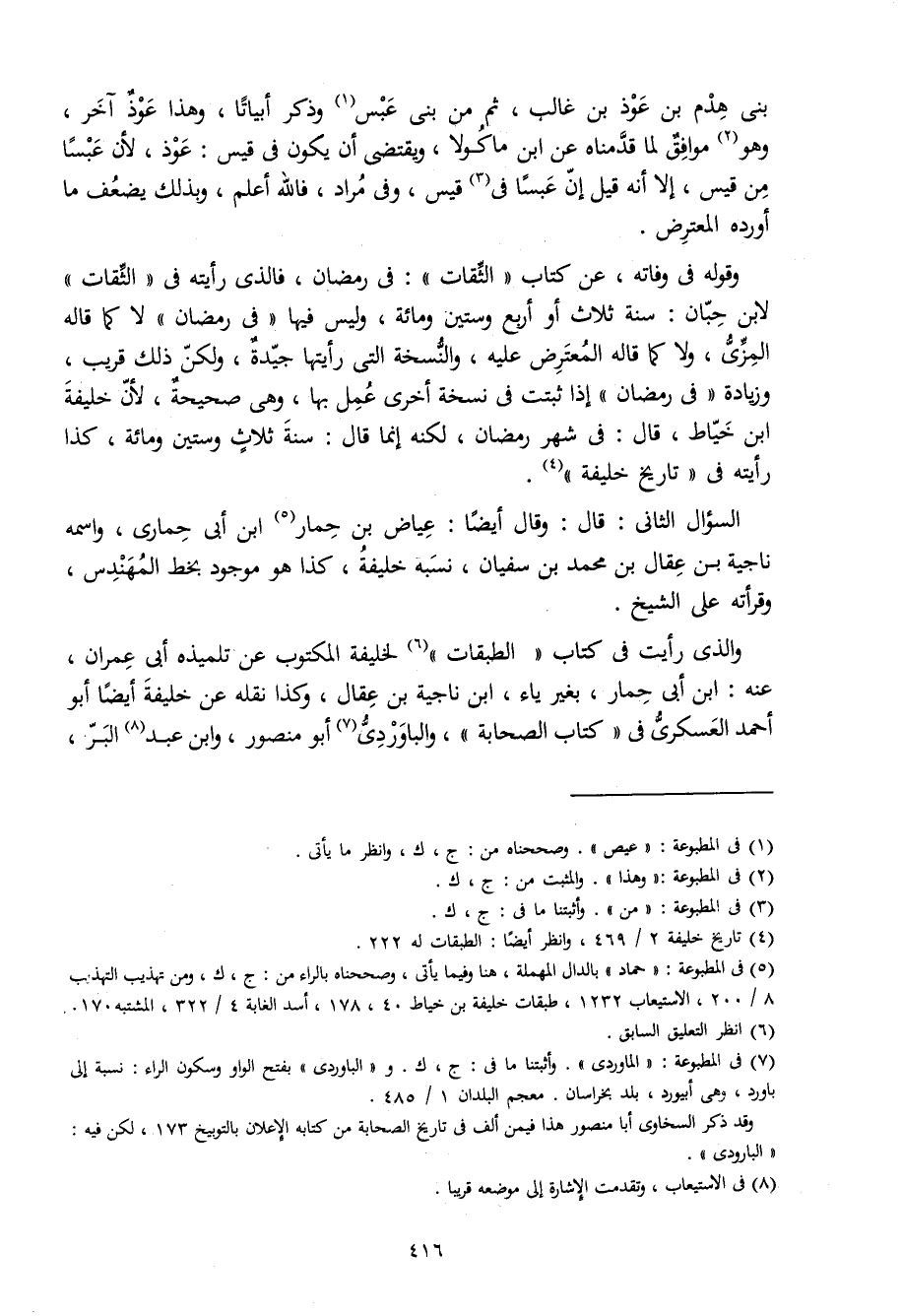 وَقَوله فِي وَفَاته عَن كتاب الثِّقَات فِي رَمَضَان فَالَّذِي رَأَيْته فِي الثِّقَات لِابْنِ حبَان سنة ثَلَاث أَو أَربع وَسِتِّينَ وَمِائَة وَلَيْسَ فِيهَا فِي رَمَضَان لَا كَمَا قَالَه الْمزي وَلَا كَمَا قَالَه الْمُعْتَرض عَلَيْهِ وَالنُّسْخَة الَّتِي رَأَيْتهَا جَيِّدَة وَلَكِن ذَلِك قريب وَزِيَادَة فِي رَمَضَان إِذا ثبتَتْ فِي نُسْخَة أُخْرَى عمل بهَا وَهِي صَحِيحَة لِأَن خَليفَة ابْن خياط قَالَ فِي شهر رَمَضَان لكنه إِنَّمَا قَالَ سنة ثَلَاث وَسِتِّينَ وَمِائَة كَذَا رَأَيْته فِي تَارِيخ خَليفَة