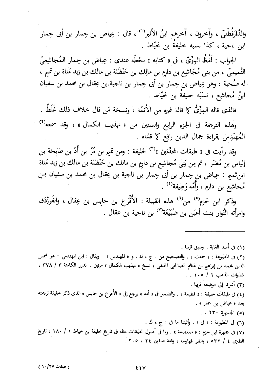 وَقد رَأَيْت فِي طَبَقَات الْمُحدثين لخليفة وَمن تَمِيم بن مر بن أد بن طابخة بن إلْيَاس بن مُضر ثمَّ من بني مجاشع بن دارم بن مَالك بن حَنْظَلَة بن مَالك بن زيد مَنَاة ابْن تَمِيم عِيَاض بن حمَار بن أبي حمَار بن نَاجِية بن عقال بن مُحَمَّد بن سُفْيَان بن مجاشع بن دارم وَأمه وطيفة