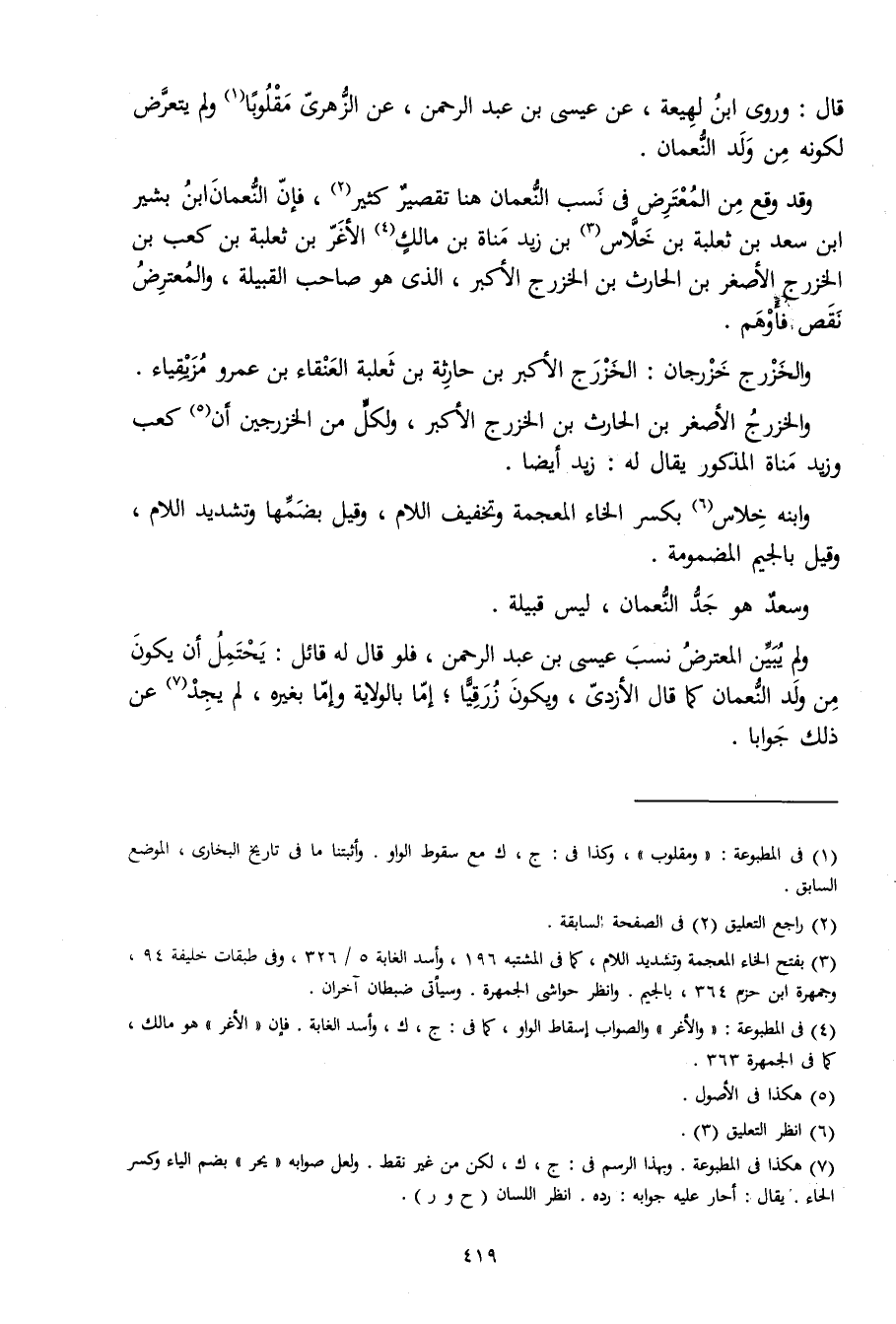 وَلم يبين الْمُعْتَرض نسب عِيسَى بن عبد الرَّحْمَن فَلَو قَالَ لَهُ قَائِل يحْتَمل أَن يكون من ولد النُّعْمَان كَمَا قَالَ الْأَزْدِيّ وَيكون زرقيا إِمَّا بِالْولَايَةِ وَإِمَّا بِغَيْرِهِ لم يجد عَن ذَلِك جَوَابا