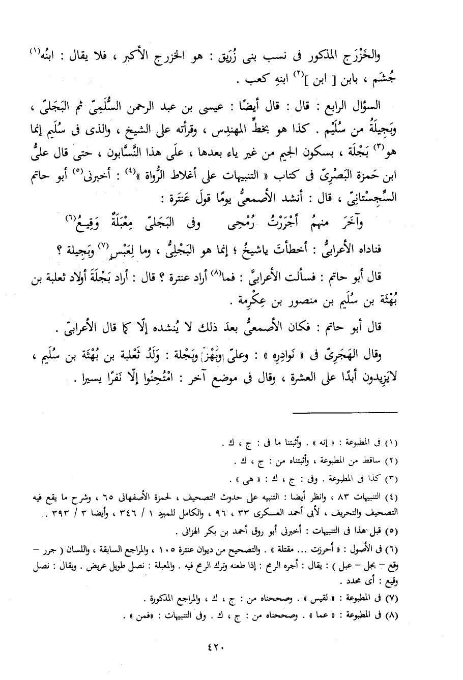 كَذَا هُوَ بِخَط المهندس وقرأته على الشَّيْخ وَالَّذِي فِي سليم إِنَّمَا هُوَ بجلة بِسُكُون الْجِيم من غير يَاء بعْدهَا على هَذَا النسابون حَتَّى قَالَ عَليّ ابْن حَمْزَة الْبَصْرِيّ فِي كتاب التَّنْبِيهَات على أغلاط الروَاة أَخْبرنِي أَبُو حَاتِم السجسْتانِي قَالَ أنْشد الْأَصْمَعِي يَوْمًا قَول عنترة