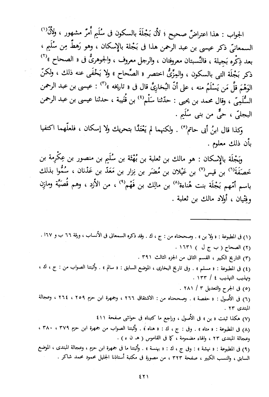 الْجَواب هَذَا اعْتِرَاض صَحِيح لِأَن بجلة بِالسُّكُونِ فِي سليم أَمر مَشْهُور وَلِأَن السَّمْعَانِيّ ذكر عِيسَى بن عبد الرَّحْمَن هَذَا فِي بجلة بالإسكان وَهُوَ رَهْط من سليم بعد ذكره بجيلة فالنسبتان معروفتان وَالرجل مَعْرُوف والجوهري فِي الصِّحَاح ذكر بجلة الَّتِي بِالسُّكُونِ والمزي اختصر الصِّحَاح وَلَا يخفى عَنهُ ذَلِك وَلَكِن الْوَهم قل من يسلم مِنْهُ على أَن البُخَارِيّ قَالَ فِي تَارِيخه عِيسَى بن عبد الرَّحْمَن السّلمِيّ وَقَالَ مُحَمَّد بن يحيى حَدثنَا سلم بن قُتَيْبَة حَدثنَا عِيسَى بن عبد الرَّحْمَن البَجلِيّ حَيّ من بني سليم