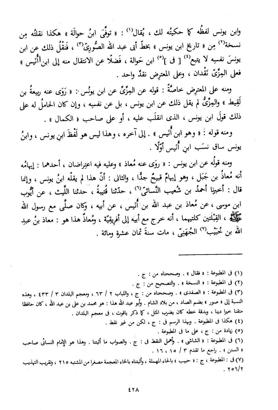 وَابْن يُونُس لَفظه كَمَا حكيته لَك يُقَال توفّي ابْن حِوَالَة هَكَذَا نقلته من نُسْخَة من تَارِيخ ابْن يُونُس بِخَط أبي عبد الله الصُّورِي فَنقل ذَلِك عَن ابْن يُونُس نَفسه لَا يتبع فِي ابْن حِوَالَة فضلا عَن الِانْتِقَال مِنْهُ إِلَى ابْن أنيس فعلى الْمزي نقدان وعَلى الْمُعْتَرض نقد وَاحِد