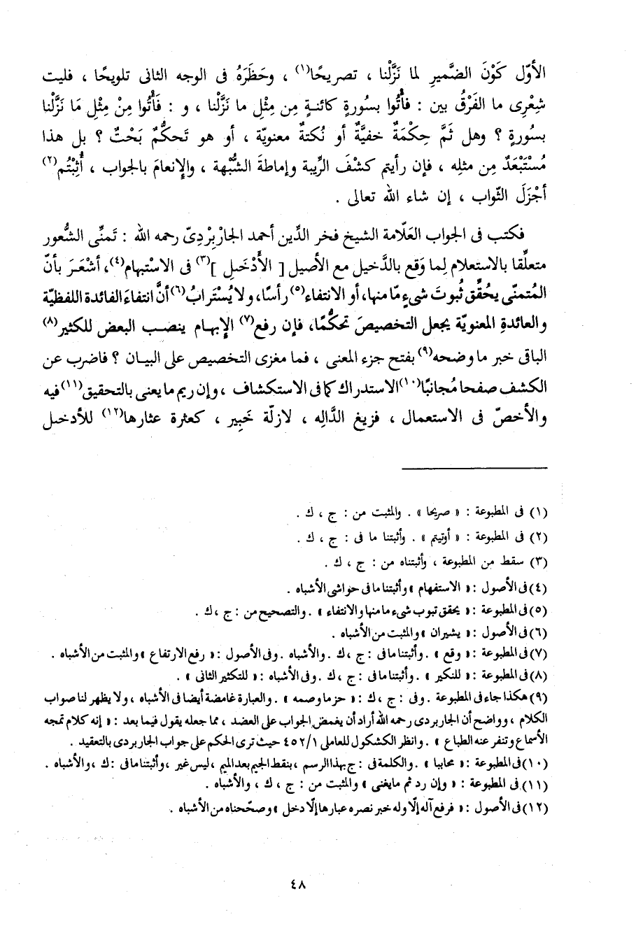 فَكتب فِي الْجَواب الْعَلامَة الشَّيْخ فَخر الدّين أَحْمد الجاربردي رَحمَه الله تمني الشُّعُور مُتَعَلقا بالاستعلام لما وَقع بالدخيل مَعَ الْأَصِيل الأدخل فِي الاستبهام أشعر بِأَن المتمني يُحَقّق ثُبُوت شَيْء مَا مِنْهَا أَو الانتفاء رَأْسا وَلَا يستراب أَن انْتِفَاء الْفَائِدَة اللفظية والعائدة المعنوية يَجْعَل التَّخْصِيص تحكما فَإِن رفع الْإِبْهَام ينصب الْبَعْض للكثير الْبَاقِي خبر مَا وضحه بِفَتْح جُزْء الْمَعْنى فَمَا مغزى التَّخْصِيص على الْبَيَان فَاضْرب عَن الْكَشْف صفحا مجانبا الِاسْتِدْرَاك كَمَا فِي الاستكشاف وَإِن ريم مَا يَعْنِي بالتحقيق فِيهِ والأخص فِي الِاسْتِعْمَال فزيغ الداله لَا زلَّة خَبِير كعثرة عثارها للأدخل