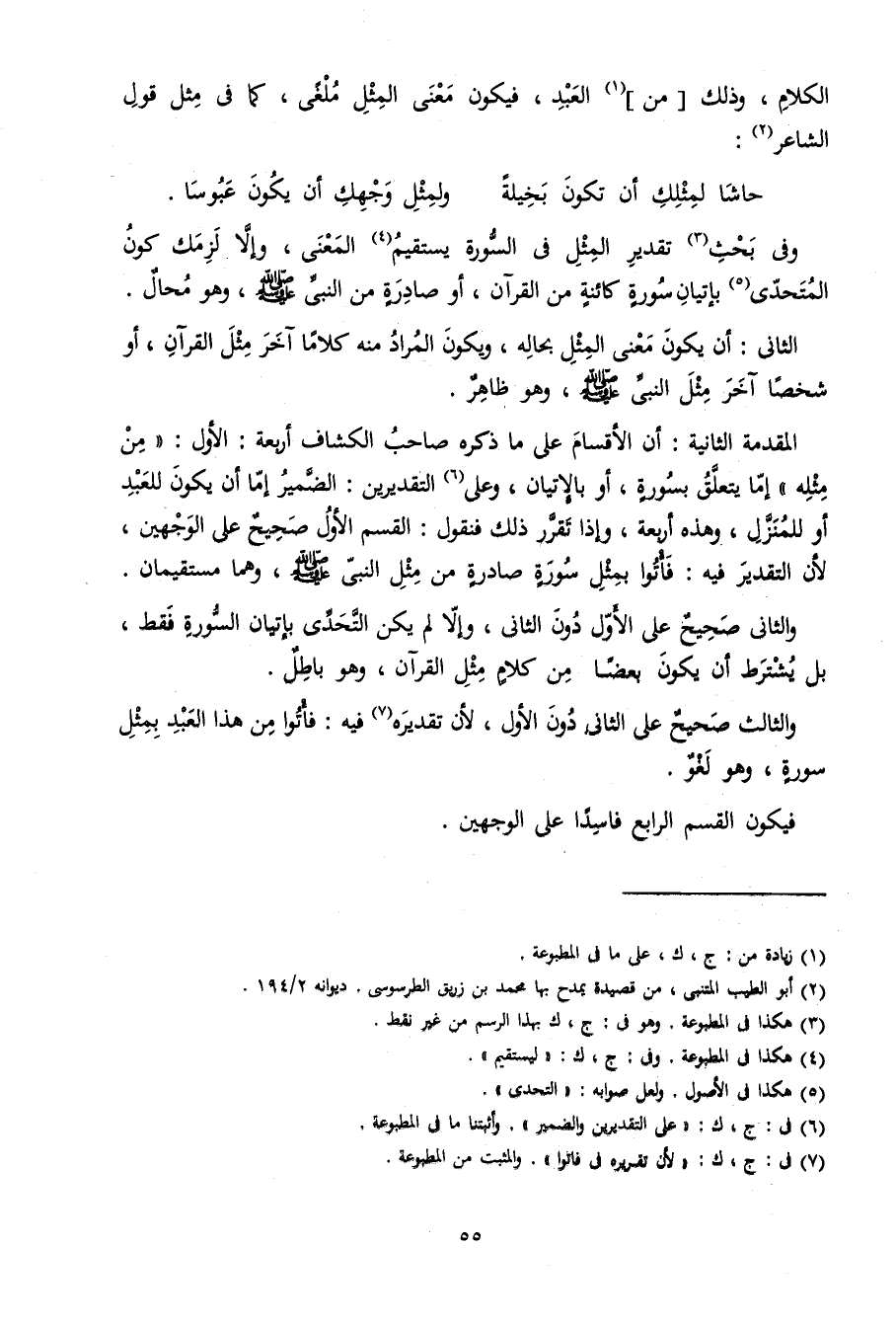 وَالثَّانِي صَحِيح على الأول دون الثَّانِي وَإِلَّا لم يكن التحدي بإتيان السُّورَة فَقَط بل يشْتَرط أَن يكون بَعْضًا من كَلَام مثل الْقُرْآن وَهُوَ بَاطِل