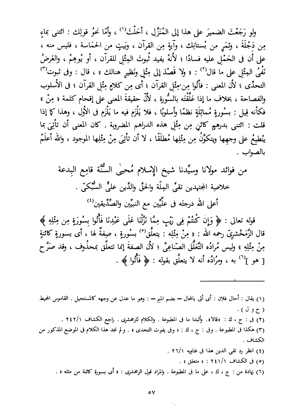 وَلَو رجعت الضَّمِير على هَذَا إِلَى الْمنزل أحلّت وَأما نَحْو قَوْلك ائْتِنِي بِمَاء من دجلة وثمر من بستانك وَآيَة من الْقُرْآن وَبَيت من الحماسة فَلَيْسَ مِنْهُ على أَن فِي الْحمل عَلَيْهِ فَسَادًا لِأَنَّهُ يُفِيد ثُبُوت الْمثل لِلْقُرْآنِ أَو يُوهم وَالْغَرَض نفي الْمثل على مَا قَالَ وَلَا قصد إِلَى مثل وَنَظِير هُنَالك قَالَ وَفِي ثُبُوت التحدي لِأَن الْمَعْنى فَأتوا من مثل الْقُرْآن أَي من كَلَام مثل الْقُرْآن فِي الأسلوب والفصاحة بِخِلَاف مَا إِذا علقته بالسورة لِأَن حَقِيقَة الْمَعْنى على إقحام كلمة من فَكَأَنَّهُ قيل بِسُورَة مماثلة نظما وأسلوبا فَلَا يلْزم فِيهِ مَا يلْزم فِي الأول وَهَذَا كَمَا إِذا قلت ائْتِنِي بدرهم كَائِن من مثل هَذِه الدَّرَاهِم المضروبة