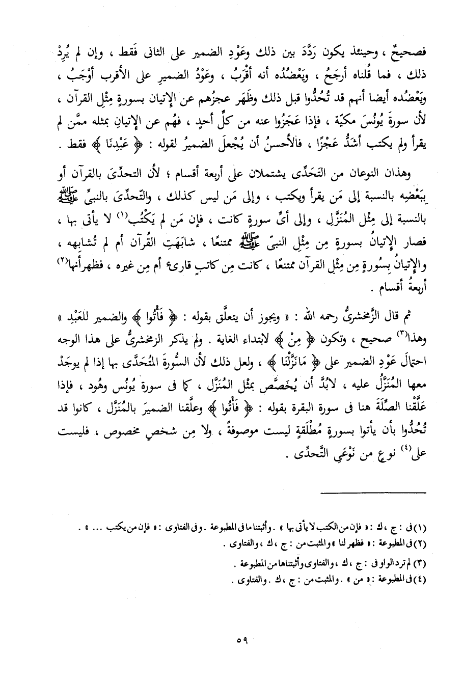 وَلم يذكر الزَّمَخْشَرِيّ على هَذَا الْوَجْه احْتِمَال عود الضَّمِير على {مِمَّا نزلنَا} وَلَعَلَّ ذَلِك لِأَن السُّورَة المتحدى بهَا إِذا لم يُوجد مَعهَا الْمنزل عَلَيْهِ لَا بُد أَن يخصص بِمثل الْمنزل كَمَا فِي سُورَة يُونُس وَهود فَإِذا علقنا الصِّلَة هُنَا فِي سُورَة الْبَقَرَة بقوله {فَأتوا} وعلقنا الضَّمِير بالمنزل كَانُوا قد تحدوا بِأَن يَأْتُوا بِسُورَة مُطلقَة لَيست مَوْصُوفَة وَلَا من شخص مَخْصُوص فَلَيْسَتْ على نوع من نَوْعي التحدي