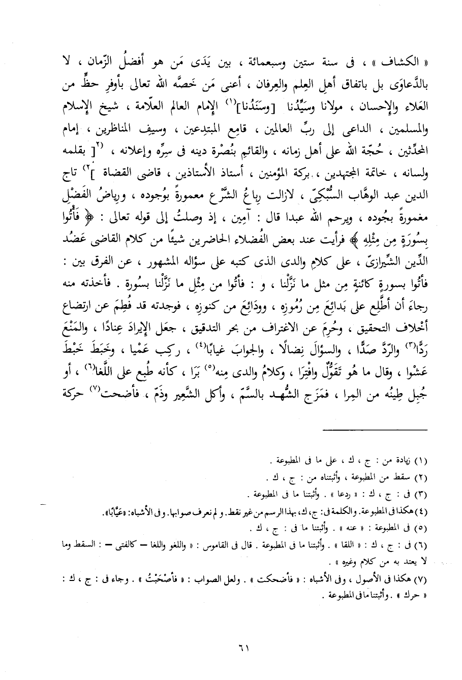 الْكَشَّاف فِي سنة سِتِّينَ وَسَبْعمائة بَين يَدي من هُوَ أفضل الزَّمَان لَا بالدعاوي بل بِاتِّفَاق أهل الْعلم والعرفان أَعنِي من خصّه الله تَعَالَى بأوفر حَظّ من الْعَلَاء وَالْإِحْسَان مَوْلَانَا وَسَيِّدنَا وسندنا الإِمَام الْعَالم الْعَلامَة شيخ الْإِسْلَام وَالْمُسْلِمين الدَّاعِي إِلَى رب الْعَالمين قامع المبتدعين وَسيف المناظرين إِمَام الْمُحدثين حجَّة الله على أهل زَمَانه والقائم بنصرة دينه فِي سره وإعلانه بقلمه وَلسَانه خَاتِمَة الْمُجْتَهدين بركَة الْمُؤمنِينَ أستاذ الأستاذين قَاضِي الْقُضَاة تَاج الدّين عبد الْوَهَّاب السُّبْكِيّ لَا زَالَت رباع الشَّرْع معمورة بِوُجُودِهِ ورياض الْفضل مغمورة بجوده وَيرْحَم الله عبدا قَالَ آمين إِذْ وصلت إِلَى قَوْله تَعَالَى {فَأتوا بِسُورَة من مثله} فَرَأَيْت عِنْد بعض الْفُضَلَاء الْحَاضِرين شَيْئا من كَلَام القَاضِي عضد الدّين الشِّيرَازِيّ على كَلَام وَالِدي الَّذِي كتبه على سُؤَاله الْمَشْهُور عَن الْفرق بَين فَأتوا بِسُورَة كائنة من مثل مَا نزلنَا وفَأتوا من مثل مَا نزلنَا بِسُورَة
