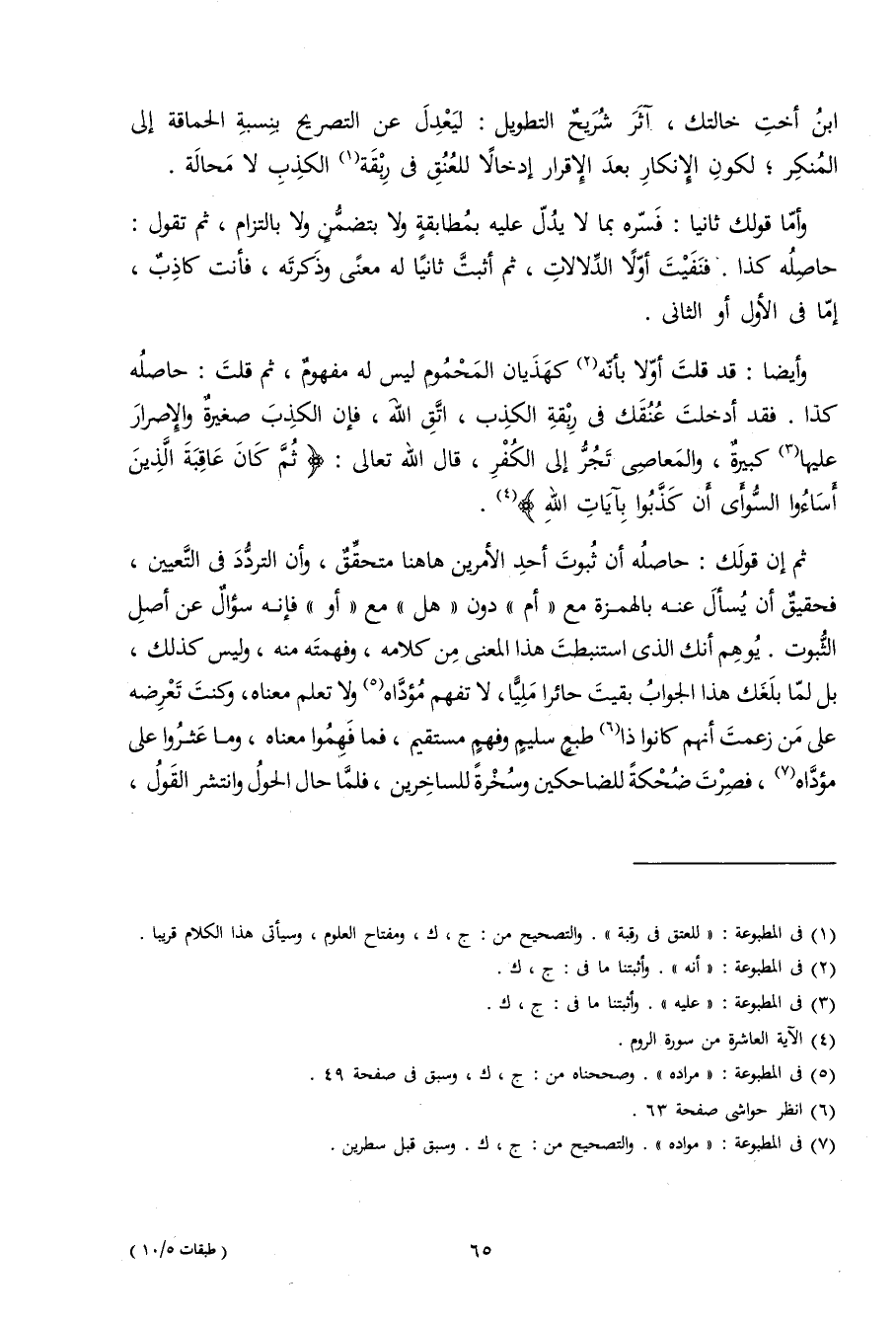يُوهم أَنَّك الَّذِي استنبطت هَذَا الْمَعْنى من كَلَامه وفهمته مِنْهُ وَلَيْسَ كَذَلِك بل لما بلغك هَذَا الْجَواب بقيت حائرا مَلِيًّا لَا تفهم مؤداه وَلَا تعلم مَعْنَاهُ وَكنت تعرضه على نمن زعمت أَنهم كَانُوا ذَا طبع سليم وَفهم مُسْتَقِيم فَمَا فَهموا مَعْنَاهُ وَمَا عثروا على مؤداه فصرت ضحكة للضاحكين وسخرة للساخرين فَلَمَّا حَال الْحول وانتشر القَوْل