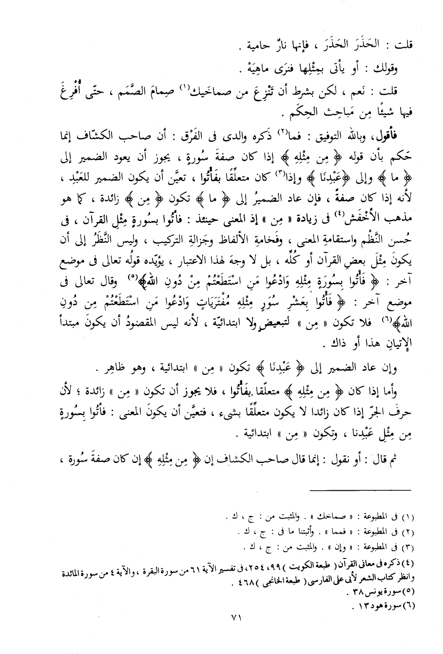 فَأَقُول وَبِاللَّهِ التَّوْفِيق فَمَا ذكره وَالِدي فِي الْفرق أَن صَاحب الْكَشَّاف إِنَّمَا حكم بِأَن قَوْله {من مثله} إِذا كَانَ صفة سُورَة يجوز أَن يعود الضَّمِير إِلَى {مَا} وَإِلَى {عَبدنَا} وَإِذا كَانَ مُتَعَلقا بفأتوا تعين أَن يكون الضَّمِير للْعَبد لِأَنَّهُ إِذا كَانَ صفة فَإِن عَاد الضَّمِير إِلَى {مَا} تكون {من} زَائِدَة كَمَا هُوَ مَذْهَب الْأَخْفَش فِي زِيَادَة من إِذْ الْمَعْنى حِينَئِذٍ فَأتوا بِسُورَة من مثل الْقُرْآن فِي حسن النّظم واستقامة الْمَعْنى وفخامة الْأَلْفَاظ وجزالة التَّرْكِيب وَلَيْسَ النّظر إِلَى أَن يكون مثل بعض الْقُرْآن أَو كُله بل لَا وَجه لهَذَا الِاعْتِبَار يُؤَيّدهُ قَوْله تَعَالَى فِي مَوضِع آخر {فَأتوا بِسُورَة مثله وَادعوا من اسْتَطَعْتُم من دون الله} وَقَالَ تَعَالَى فِي مَوضِع آخر {فَأتوا بِعشر سور مثله مفتريات وَادعوا من اسْتَطَعْتُم من دون الله} فَلَا تكون من لتبعيض وَلَا ابتدائية لِأَنَّهُ لَيْسَ الْمَقْصُود أَن يكون مُبْتَدأ الْإِتْيَان هَذَا أَو ذَاك