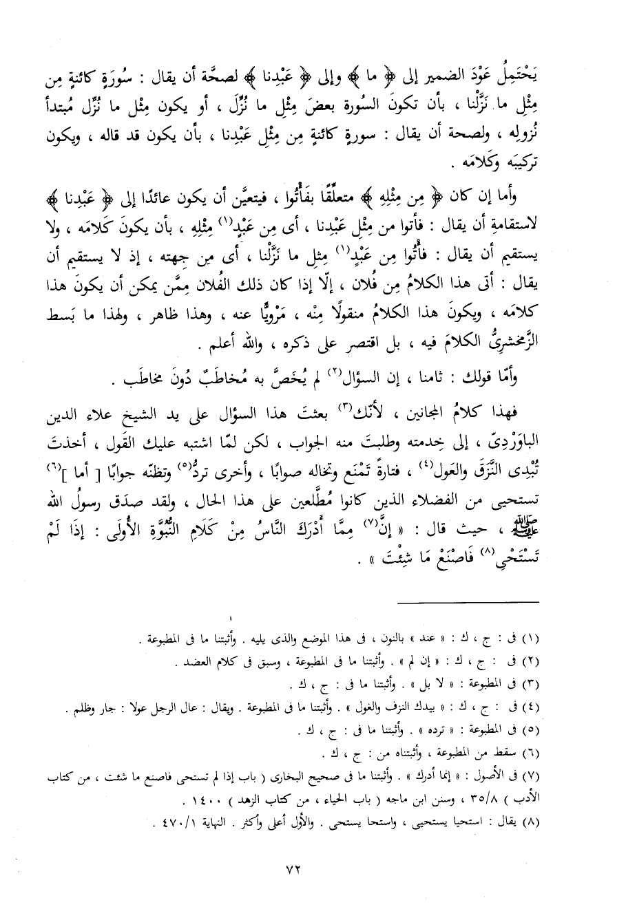 فَهَذَا كَلَام المجانين لِأَنَّك بعثت هَذَا السُّؤَال على يَد الشَّيْخ عَلَاء الدّين الباوردي إِلَى خدمته وَطلبت مِنْهُ الْجَواب لَكِن لما اشْتبهَ عَلَيْك القَوْل أخذت تبدي النزق والعول فَتَارَة تمنع وتخاله صَوَابا وَأُخْرَى ترد وتظنه جَوَابا أما تستحيي من الْفُضَلَاء الَّذين كَانُوا مطلعين على هَذَا الْحَال وَلَقَد صدق رَسُول الله صلى الله عَلَيْهِ وَسلم حَيْثُ قَالَ (إِن مِمَّا أدْرك النَّاس من كَلَام النُّبُوَّة الأولى إِذا لم تَسْتَحي فَاصْنَعْ مَا شِئْت)