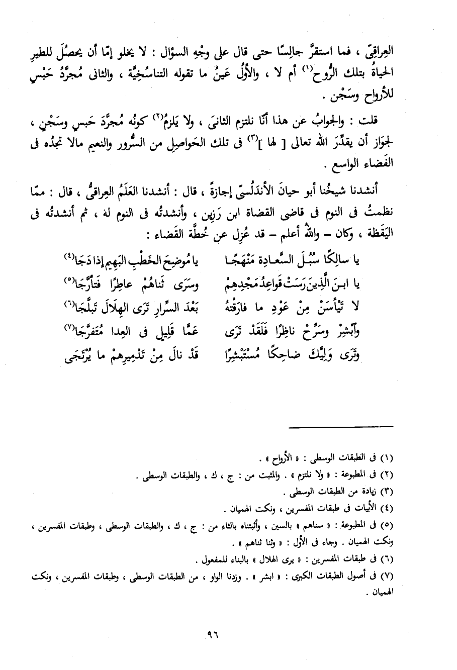 الْعِرَاقِيّ فَمَا اسْتَقر جَالِسا حَتَّى قَالَ على وَجه السُّؤَال لَا يَخْلُو إِمَّا أَن يحصل للطير الْحَيَاة بِتِلْكَ الرّوح أم لَا وَالْأول عين مَا تَقوله التناسخية وَالثَّانِي مُجَرّد حبس للأرواح وسجن