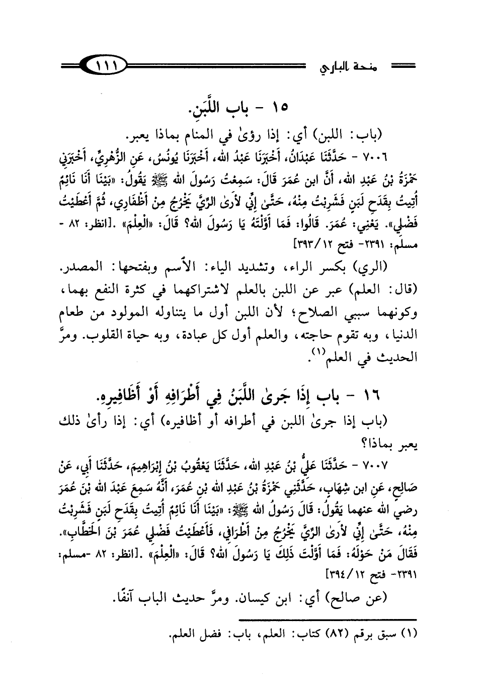 7007 - حَدَّثَنَا عَلِيُّ بْنُ عَبْدِ اللَّهِ، حَدَّثَنَا يَعْقُوبُ بْنُ إِبْرَاهِيمَ، حَدَّثَنَا أَبِي، عَنْ صَالِحٍ، عَنِ ابْنِ شِهَابٍ، حَدَّثَنِي حَمْزَةُ بْنُ عَبْدِ اللَّهِ بْنِ عُمَرَ: أَنَّهُ سَمِعَ عَبْدَ اللَّهِ بْنَ عُمَرَ رَضِيَ اللَّهُ عَنْهُمَا، يَقُولُ: قَال رَسُولُ اللَّهِ صَلَّى اللهُ عَلَيْهِ وَسَلَّمَ: "بَيْنَا أَنَا نَائِمٌ أُتِيتُ بِقَدَحِ لَبَنٍ، فَشَرِبْتُ مِنْهُ، حَتَّى إِنِّي لَأَرَى الرِّيَّ يَخْرُجُ مِنْ أَطْرَافِي، فَأَعْطَيْتُ فَضْلِي عُمَرَ بْنَ الخَطَّابِ" فَقَال مَنْ حَوْلَهُ: فَمَا أَوَّلْتَ ذَلِكَ يَا رَسُولَ اللَّهِ؟ قَال: "العِلْمَ".