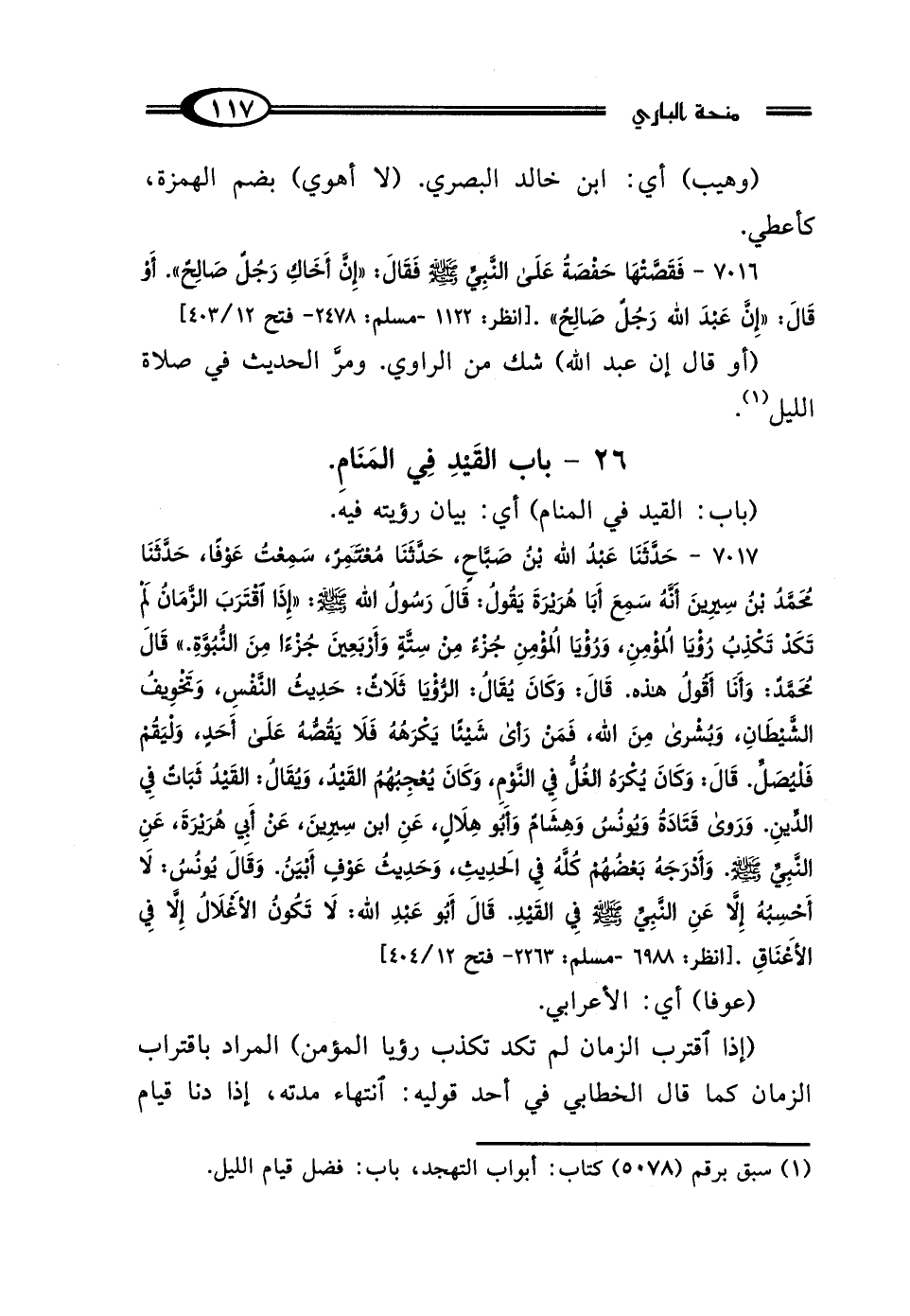 7016 - فَقَصَصْتُهَا عَلَى حَفْصَةَ، فَقَصَّتْهَا حَفْصَةُ، عَلَى النَّبِيِّ صَلَّى اللهُ عَلَيْهِ وَسَلَّمَ، فَقَال: "إِنَّ أَخَاكِ رَجُلٌ صَالِحٌ، أَوْ قَال: إِنَّ عَبْدَ اللَّهِ رَجُلٌ صَالِحٌ".