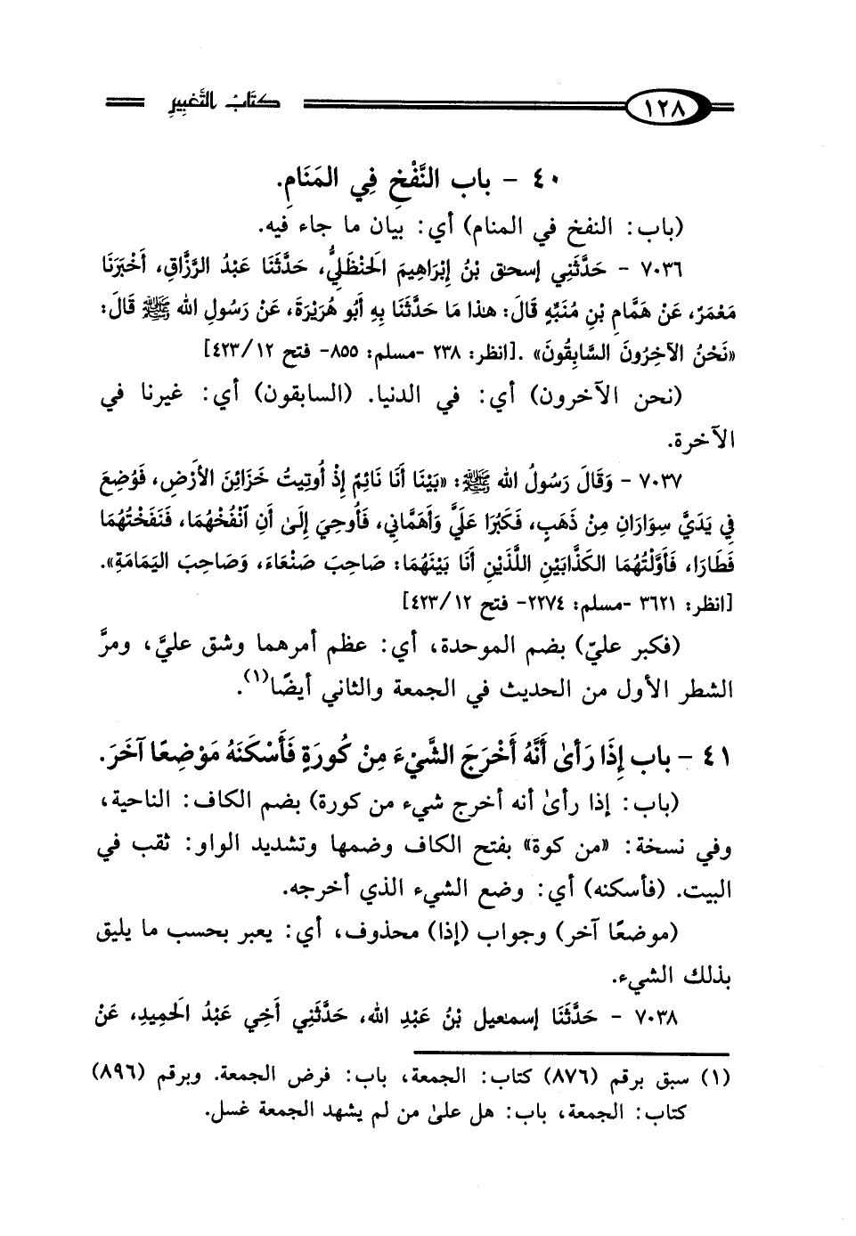 7037 - وَقَال رَسُولُ اللَّهِ صَلَّى اللهُ عَلَيْهِ وَسَلَّمَ: "بَيْنَا أَنَا نَائِمٌ إِذْ أُوتِيتُ خَزَائِنَ الأَرْضِ، فَوُضِعَ فِي يَدَيَّ سِوَارَانِ مِنْ ذَهَبٍ، فَكَبُرَا عَلَيَّ وَأَهَمَّانِي، فَأُوحِيَ إِلَيَّ أَنِ انْفُخْهُمَا، فَنَفَخْتُهُمَا فَطَارَا، فَأَوَّلْتُهُمَا الكَذَّابَيْنِ اللَّذَيْنِ أَنَا بَيْنَهُمَا: صَاحِبَ صَنْعَاءَ، وَصَاحِبَ اليَمَامَةِ".