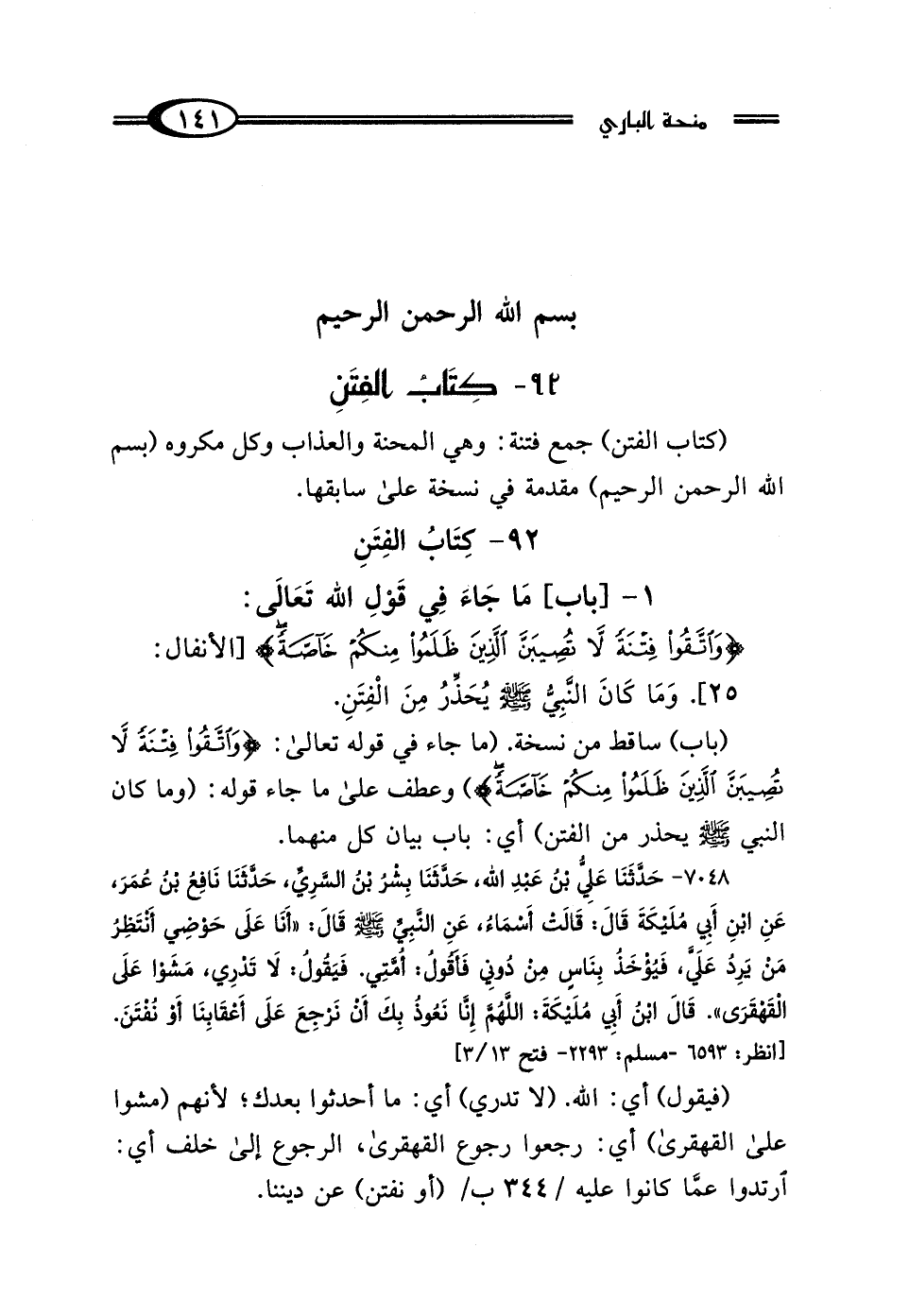 (كتاب الفتن) جمع فتنة: وهي المحنة والعذاب وكل مكروه (بِسْمِ اللَّهِ الرَّحْمَنِ الرَّحِيمِ) مقدمة في نسخة علي سابقها.