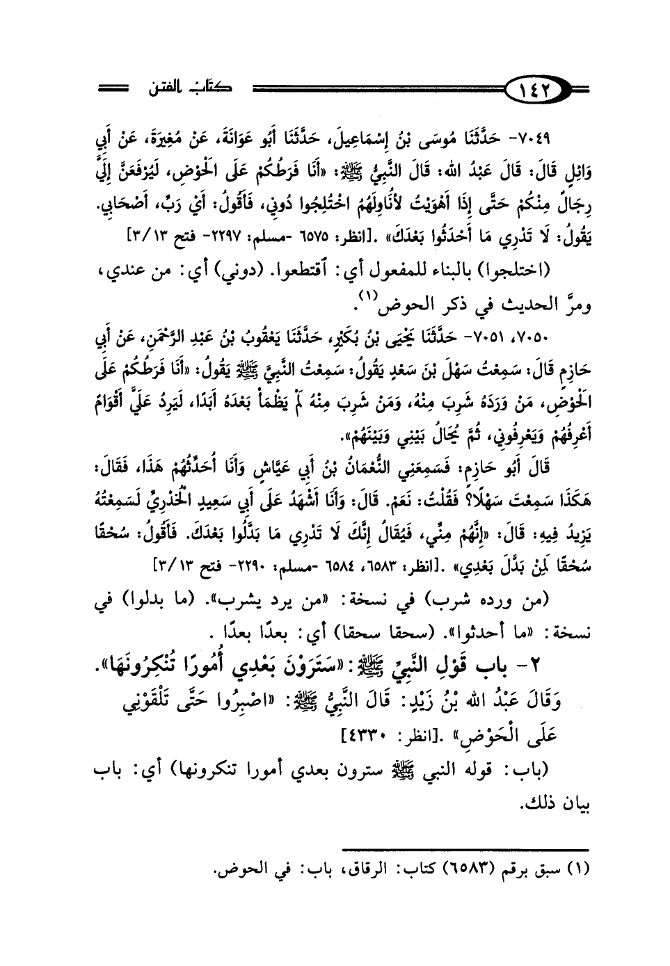 7050، 7051 - حَدَّثَنَا يَحْيَى بْنُ بُكَيْرٍ، حَدَّثَنَا يَعْقُوبُ بْنُ عَبْدِ الرَّحْمَنِ، عَنْ أَبِي حَازِمٍ، قَال: سَمِعْتُ سَهْلَ بْنَ سَعْدٍ، يَقُولُ: سَمِعْتُ النَّبِيَّ صَلَّى اللهُ عَلَيْهِ وَسَلَّمَ، يَقُولُ: "أَنَا فَرَطُكُمْ عَلَى الحَوْضِ، فَمَنْ وَرَدَهُ شَرِبَ مِنْهُ، وَمَنْ شَرِبَ مِنْهُ لَمْ يَظْمَأْ بَعْدَهُ أَبَدًا، لَيَرِدُ عَلَيَّ أَقْوَامٌ أَعْرِفُهُمْ وَيَعْرِفُونِي، ثُمَّ يُحَالُ بَيْنِي وَبَيْنَهُمْ" قَال أَبُو حَازِمٍ: فَسَمِعَنِي النُّعْمَانُ بْنُ أَبِي عَيَّاشٍ، - وَأَنَا أُحَدِّثُهُمْ هَذَا، فَقَال: هَكَذَا سَمِعْتَ سَهْلًا، فَقُلْتُ: نَعَمْ، قَال: وَأَنَا - أَشْهَدُ عَلَى أَبِي سَعِيدٍ الخُدْرِيِّ، لَسَمِعْتُهُ يَزِيدُ فِيهِ قَال: "إِنَّهُمْ مِنِّي، فَيُقَالُ: إِنَّكَ لَا تَدْرِي مَا بَدَّلُوا بَعْدَكَ، فَأَقُولُ: سُحْقًا سُحْقًا لِمَنْ بَدَّلَ بَعْدِي".