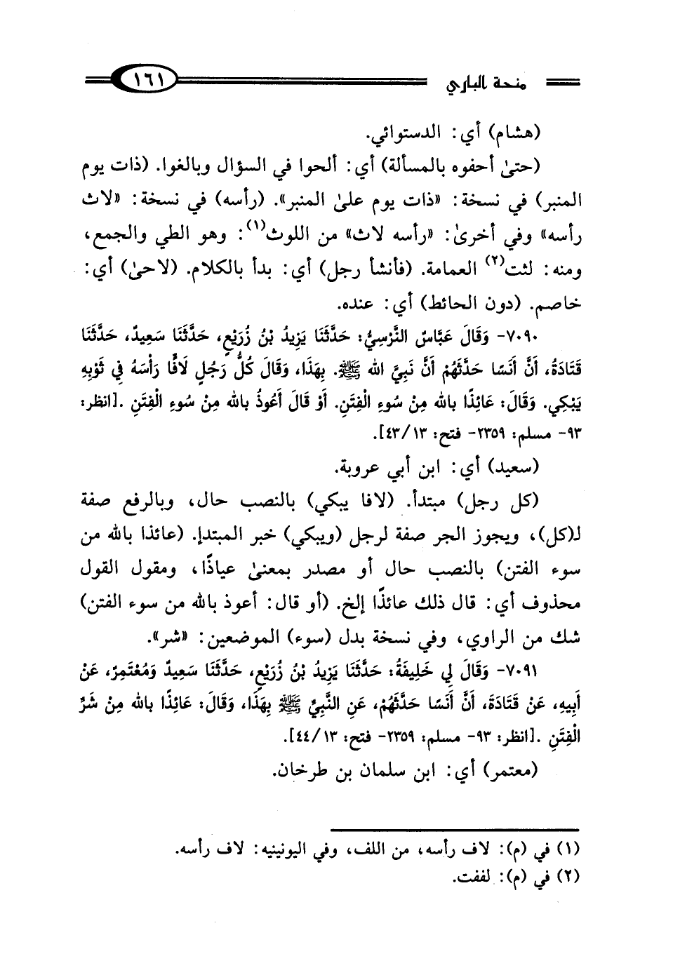 7091 - وقَال لِي خَلِيفَةُ: حَدَّثَنَا يَزِيدُ بْنُ زُرَيْعٍ، حَدَّثَنَا سَعِيدٌ، وَمُعْتَمِرٌ، عَنْ أَبِيهِ، عَنْ قَتَادَةَ، أَنَّ أَنَسًا، حَدَّثَهُمْ، عَنِ النَّبِيِّ صَلَّى اللهُ عَلَيْهِ وَسَلَّمَ بِهَذَا. وَقَال: "عَائِذًا بِاللَّهِ مِنْ شَرِّ الفِتَنِ".