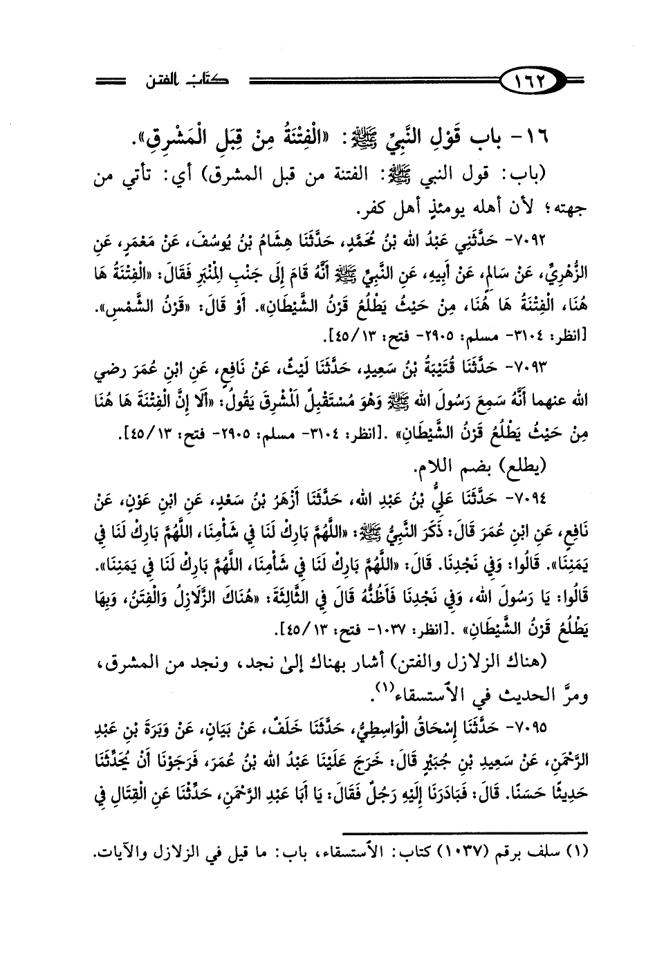 7093 - حَدَّثَنَا قُتَيْبَةُ بْنُ سَعِيدٍ، حَدَّثَنَا لَيْثٌ، عَنْ نَافِعٍ، عَنِ ابْنِ عُمَرَ، رَضِيَ اللَّهُ عَنْهُمَا: أَنَّهُ سَمِعَ رَسُولَ اللَّهِ صَلَّى اللهُ عَلَيْهِ وَسَلَّمَ، وَهُوَ مُسْتَقْبِلٌ المَشْرِقَ يَقُولُ: "أَلا إِنَّ الفِتْنَةَ هَا هُنَا، مِنْ حَيْثُ يَطْلُعُ قَرْنُ الشَّيْطَانِ".
