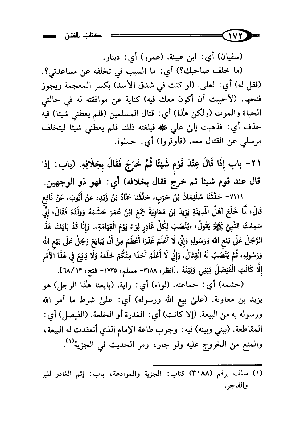 7111 - حَدَّثَنَا سُلَيْمَانُ بْنُ حَرْبٍ، حَدَّثَنَا حَمَّادُ بْنُ زَيْدٍ، عَنْ أَيُّوبَ، عَنْ نَافِعٍ، قَال: لَمَّا خَلَعَ أَهْلُ المَدِينَةِ يَزِيدَ بْنَ مُعَاويَةَ، جَمَعَ ابْنُ عُمَرَ، حَشَمَهُ وَوَلَدَهُ، فَقَال: إِنِّي سَمِعْتُ النَّبِيَّ صَلَّى اللهُ عَلَيْهِ وَسَلَّمَ يَقُولُ: "يُنْصَبُ لِكُلِّ غَادِرٍ لِوَاءٌ يَوْمَ القِيَامَةِ" وَإِنَّا قَدْ بَايَعْنَا هَذَا الرَّجُلَ عَلَى بَيْعِ اللَّهِ وَرَسُولِهِ، وَإِنِّي لَا أَعْلَمُ غَدْرًا أَعْظَمَ مِنْ أَنْ يُبَايَعَ رَجُلٌ عَلَى بَيْعِ اللَّهِ وَرَسُولِهِ ثُمَّ يُنْصَبُ لَهُ القِتَالُ، وَإِنِّي لَا أَعْلَمُ أَحَدًا مِنْكُمْ خَلَعَهُ، وَلَا بَايَعَ فِي هَذَا الأَمْرِ، إلا كَانَتِ الفَيْصَلَ بَيْنِي وَبَيْنَهُ.