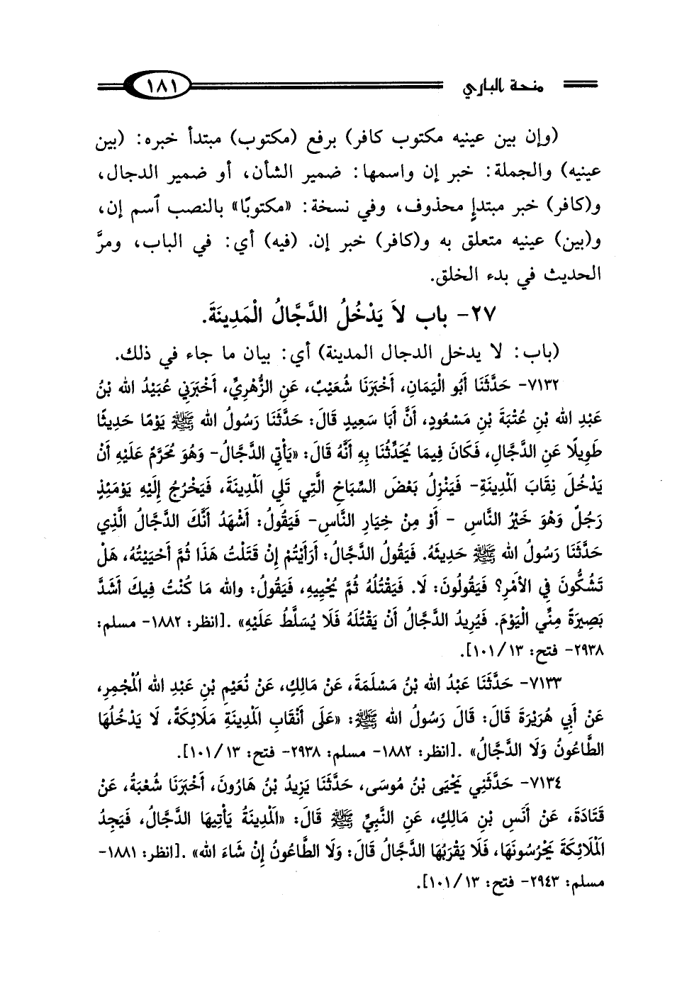 7132 - حَدَّثَنَا أَبُو اليَمَانِ، أَخْبَرَنَا شُعَيْبٌ، عَنِ الزُّهْرِيِّ، أَخْبَرَنِي عُبَيْدُ اللَّهِ بْنُ عَبْدِ اللَّهِ بْنِ عُتْبَةَ بْنِ مَسْعُودٍ، أَنَّ أَبَا سَعِيدٍ، قَال: حَدَّثَنَا رَسُولُ اللَّهِ صَلَّى اللهُ عَلَيْهِ وَسَلَّمَ يَوْمًا حَدِيثًا طَويلًا عَنِ الدَّجَّالِ، فَكَانَ فِيمَا يُحَدِّثُنَا بِهِ أَنَّهُ قَال: "يَأْتِي الدَّجَّالُ، وَهُوَ مُحَرَّمٌ عَلَيْهِ أَنْ يَدْخُلَ نِقَابَ المَدِينَةِ، فَيَنْزِلُ بَعْضَ السِّبَاخِ الَّتِي تَلِي المَدِينَةَ، فَيَخْرُجُ إِلَيْهِ يَوْمَئِذٍ رَجُلٌ، وَهُوَ خَيْرُ النَّاسِ - أَوْ مِنْ خِيَارِ النَّاسِ - فَيَقُولُ أَشْهَدُ أَنَّكَ الدَّجَّالُ الَّذِي حَدَّثَنَا رَسُولُ اللَّهِ صَلَّى اللهُ عَلَيْهِ وَسَلَّمَ حَدِيثَهُ، فَيَقُولُ الدَّجَّالُ: أَرَأَيْتُمْ إِنْ قَتَلْتُ هَذَا، ثُمَّ أَحْيَيْتُهُ، هَلْ تَشُكُّونَ فِي الأَمْرِ؟ فَيَقُولُونَ: لَا، فَيَقْتُلُهُ ثُمَّ يُحْيِيهِ، فَيَقُولُ: وَاللَّهِ مَا كُنْتُ فِيكَ أَشَدَّ بَصِيرَةً مِنِّي اليَوْمَ، فَيُرِيدُ الدَّجَّالُ أَنْ يَقْتُلَهُ فَلَا يُسَلَّطُ عَلَيْهِ".