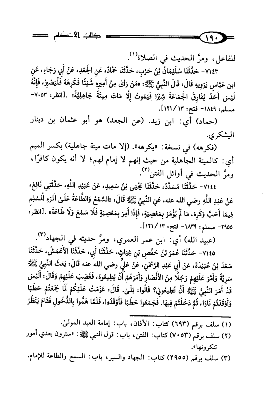 7143 - حَدَّثَنَا سُلَيْمَانُ بْنُ حَرْبٍ، حَدَّثَنَا حَمَّادٌ، عَنِ الجَعْدِ، عَنْ أَبِي رَجَاءٍ، عَنِ ابْنِ عَبَّاسٍ يَرْويهِ، قَال: قَال النَّبِيُّ صَلَّى اللهُ عَلَيْهِ وَسَلَّمَ: "مَنْ رَأَى مِنْ أَمِيرِهِ شَيْئًا فَكَرِهَهُ فَلْيَصْبِرْ، فَإِنَّهُ لَيْسَ أَحَدٌ يُفَارِقُ الجَمَاعَةَ شِبْرًا فَيَمُوتُ، إلا مَاتَ مِيتَةً جَاهِلِيَّةً".
