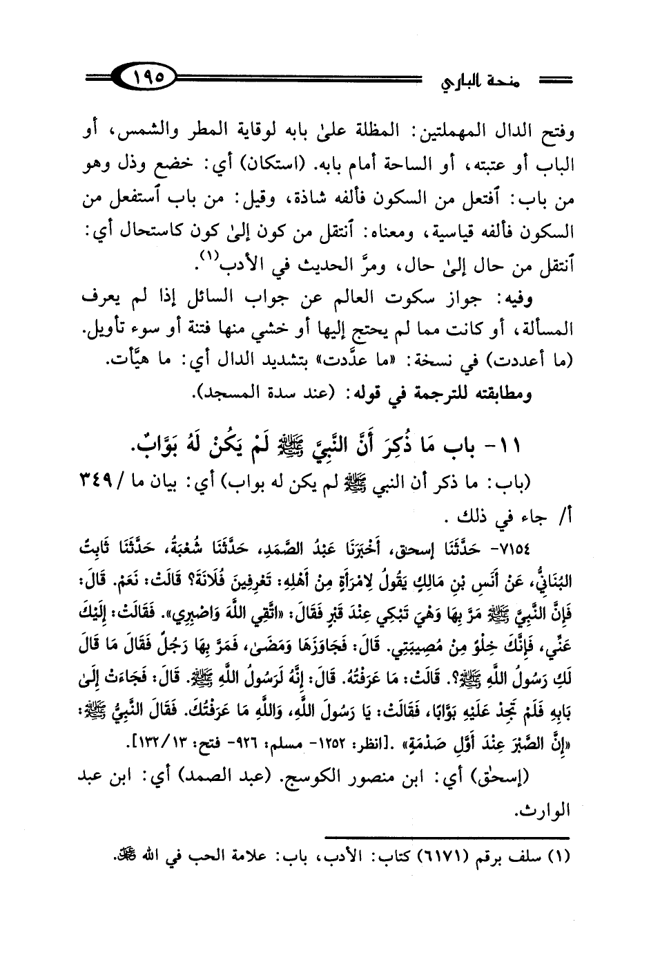 11 - بَابُ مَا ذُكِرَ أَنَّ النَّبِيَّ صَلَّى اللهُ عَلَيْهِ وَسَلَّمَ لَمْ يَكُنْ لَهُ بَوَّابٌ